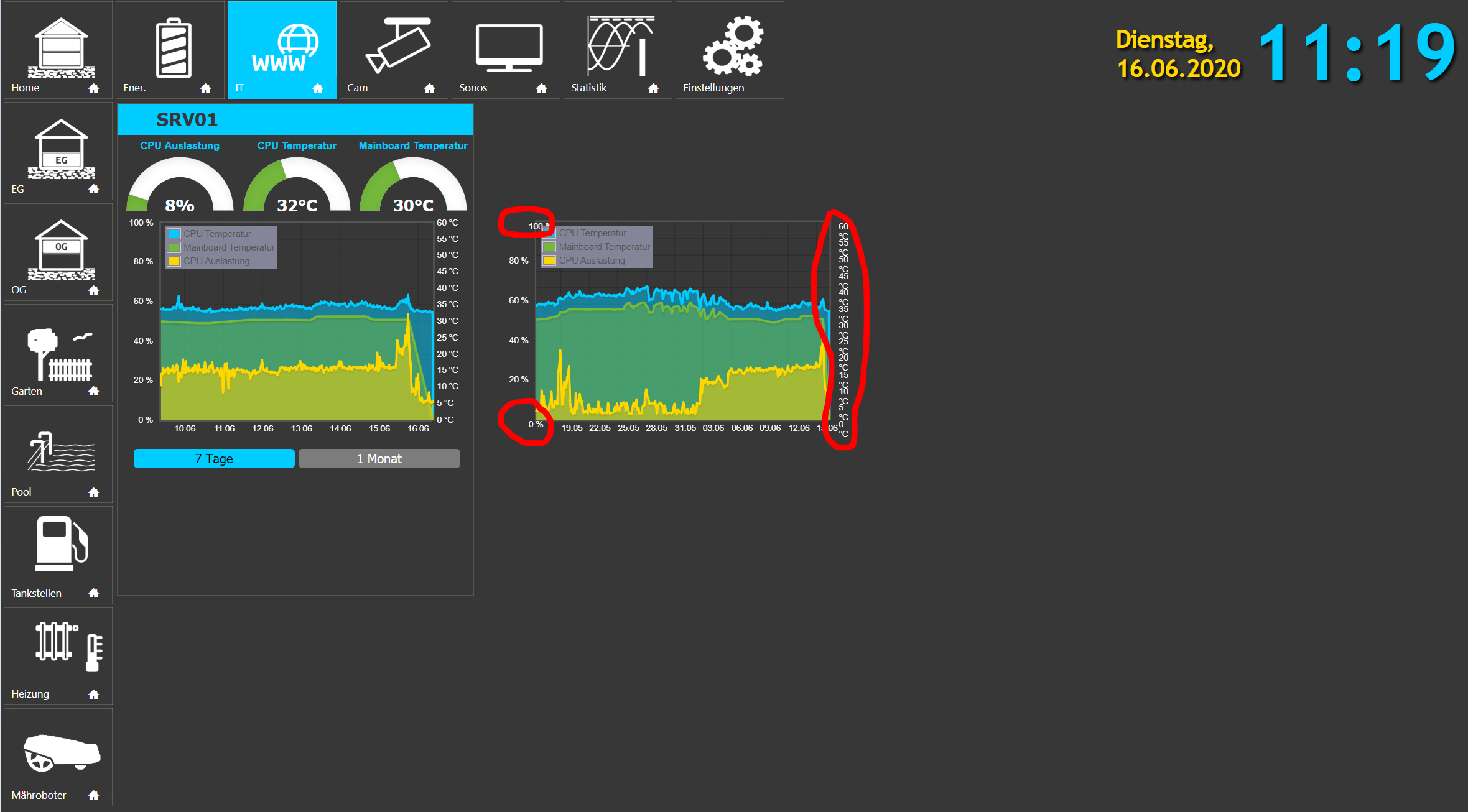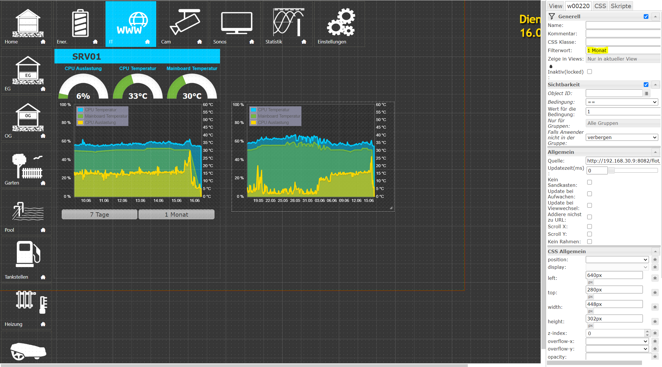 Frontend mit 2 unterschiedlichen Filterwörtern (linkes Diagr. mit "7 Tage", rechtes Diagr. mit "1 Monat" Filterwort):