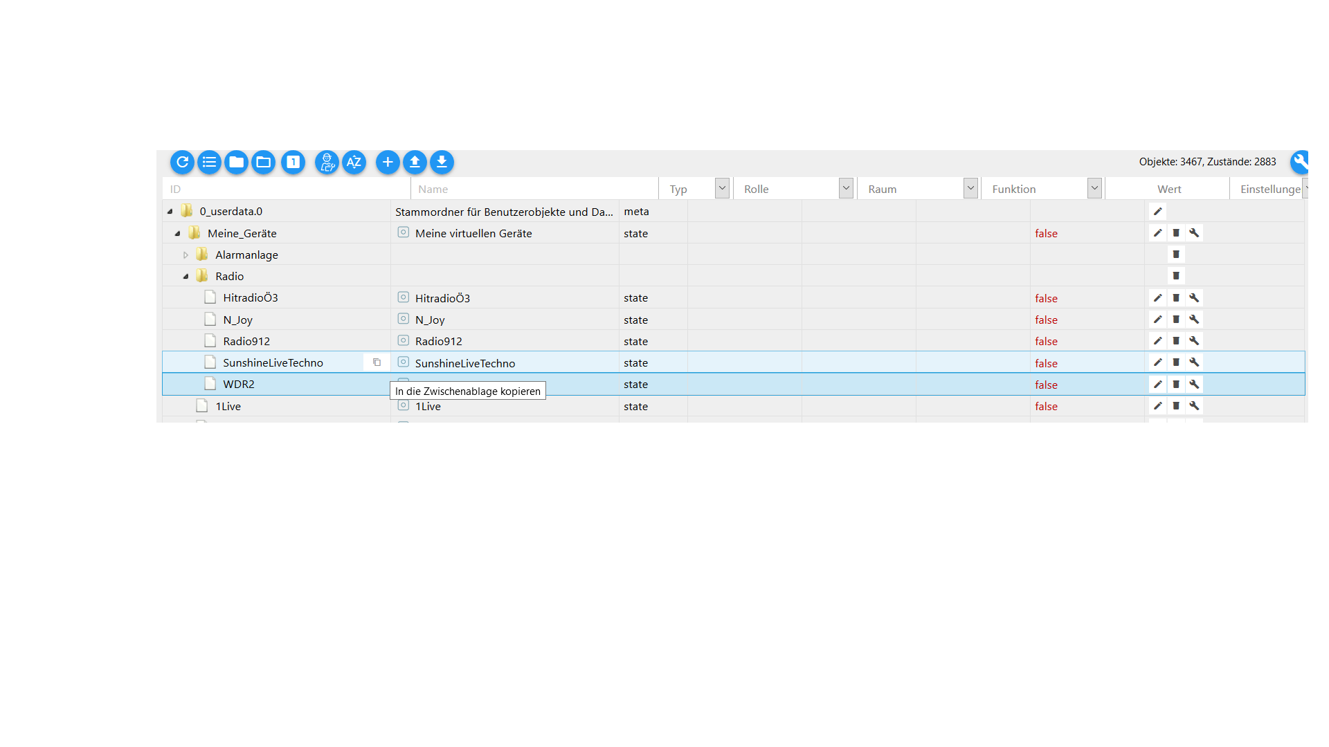 Das ganze funktioniert auch. Die Buttons wechseln bei Aktivierung auf gelb und beim 2. mal drücken wieder auf grau und die Soundtouch geht aus. Wenn ich allerings zwischen den 6 Sendern hin un her schalte, bleiben alle Buttons auf gelb.
