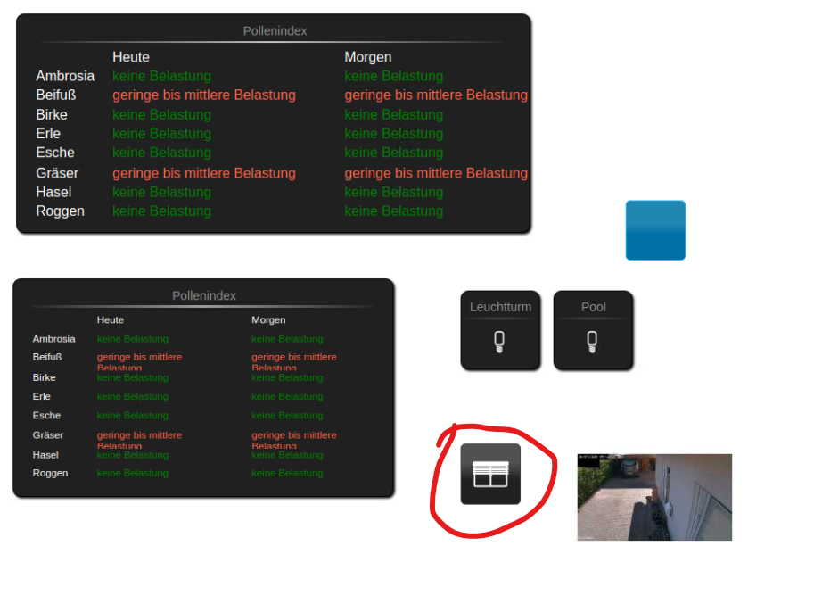 Moin :-) Ich habe da mal eine Frage. Aktuell habe ich die Material Design Top App Bar Navigation mit einer Übersicht und je einer View für Rollläden und Lampen aktiv. Zu Hause wird es aber nicht so gut angenommen, dass man erst auf´s Menü klicken muss und dann z.B. die View zum Rollläden steuern aufrufen kann. Also habe ich das jqui view in dialog Widget genommen und die View für die Rollläden hinterlegt. Funktioniert auch gut, bei Klick darauf öffnet sich die View formatfüllend über den Tablet-Bildschirm. Wenn ich aber einen Rollladen steuern will, dann öffnet sich der Dialog im Hintergrund, hinter der Rollladen-View, ist also nicht bedienbar. Hat da jemand eine Lösung für? Mit dem Z-Index spielen hat da nichts gebracht.