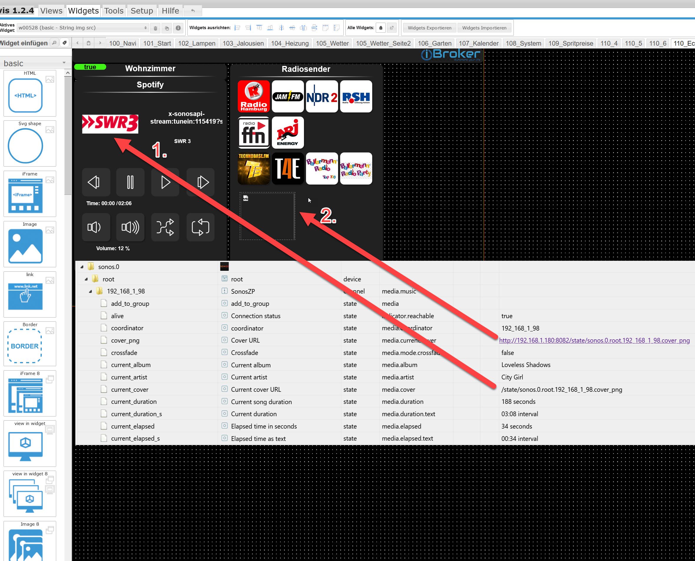 In der App sieht es bei beiden Widget so aus wie bei der Nummer 2.Beide Widgets sind String img src. Dem ersten habe ich die State ohne http zugewiesen. Dies wird im Browser angezeigt aber in der App nicht. Dann habe ich gelesen das es ein http benötigt. Dies ist in dem Sonos Adapter auch enthalten. Habe ich dann in dem 2ten Widget ausprobiert. Leider ohne Erfolg.