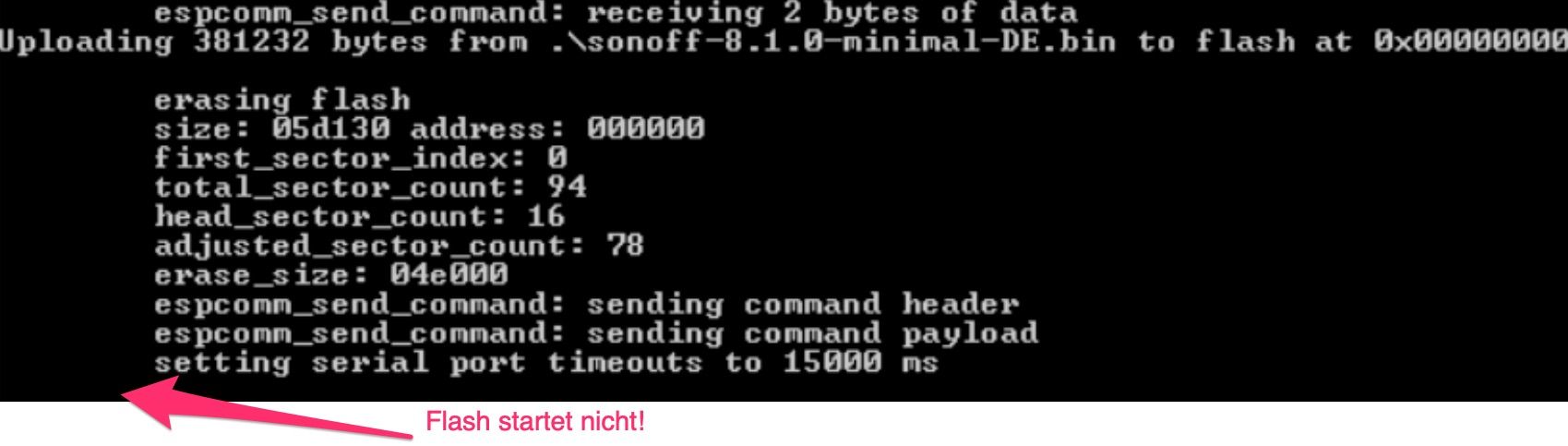 timeouts to 1000 ms fehlt vor dem Flashen.