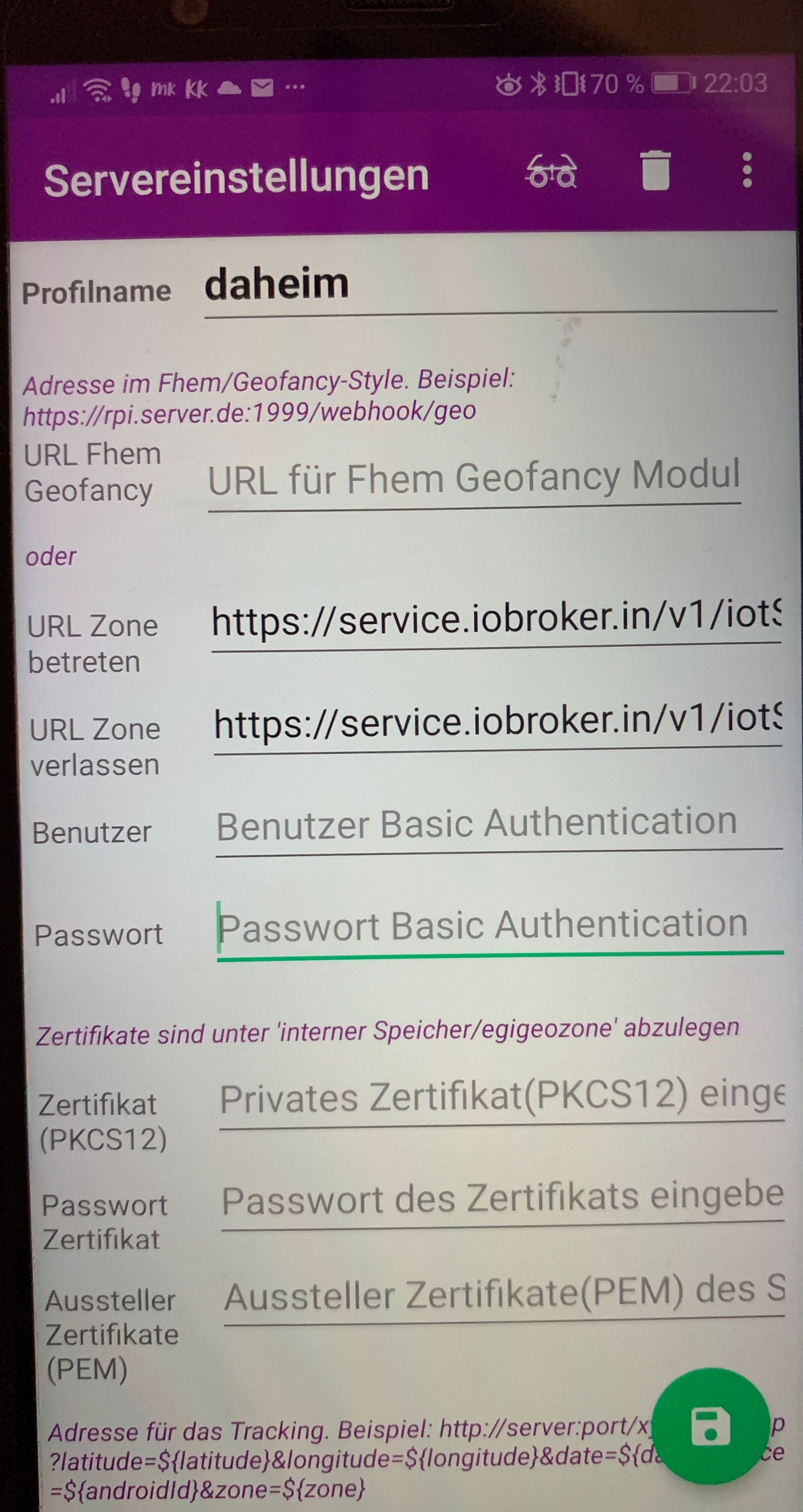 Nun möchte ich das ganze auch bei einem android smartphone machen. Da es hierfür die geofency app nicht gibt bin ich auf die app egigeozone gestoßen. Hierfür gibt es sogar einen Adapter, was ich aber nicht verstehe man muss immer eine locale URL angeben, dass bringt mir relativ wenig wenn ich das zuhause verlasse und dann schon kein WLAN Empfang mehr habe.