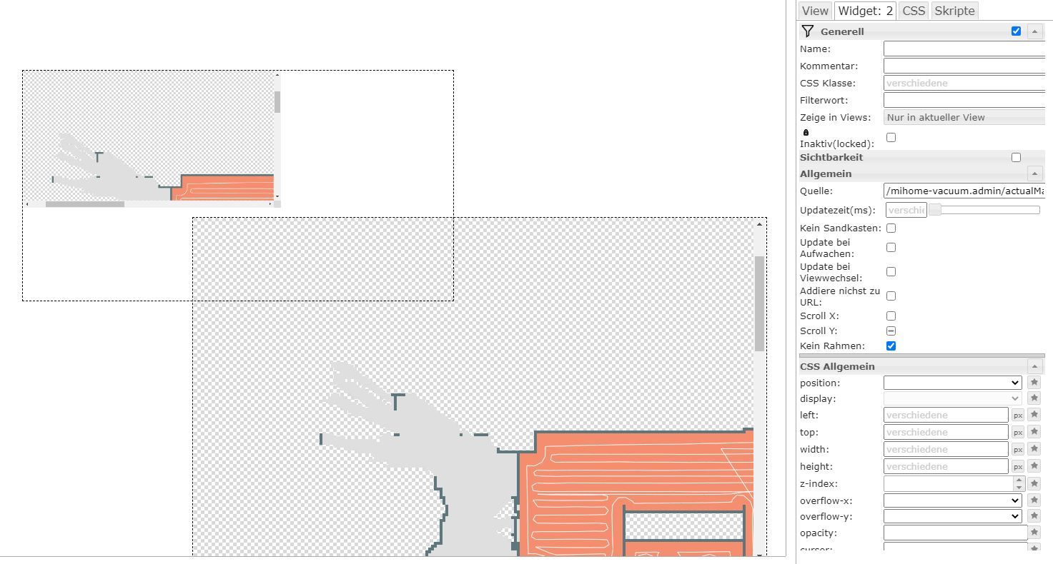 Ich arbeite mich so langsam mit erweiterten PC-Grundkenntnissen (keine Programmierkenntnisse) in ioBroker und Vis ein. Ich habe einiges geschafft, unter anderem mit dem Adapter mihome-vacuum die Karte mittels iFrame einzubinden. Leider stellt sich die Karte viel zu groß dar. Mittels CSS "smaller" konnte ich die Größe zwar verändern, aber somit bleibt das Widget selbst trotzdem größer und ich sehe nicht den benötigten Kartenausschnitt. Durch das scrollen kann ich zwar die Karte richtig positionieren, jedoch hat sich das mit der nächsten Aktualisierung ja erledigt. Ich habe schon im Forum gesucht, aber keine passende Lösung gefunden. Hat jemand einen Tipp für mich?Viele Grüße, Klaus!