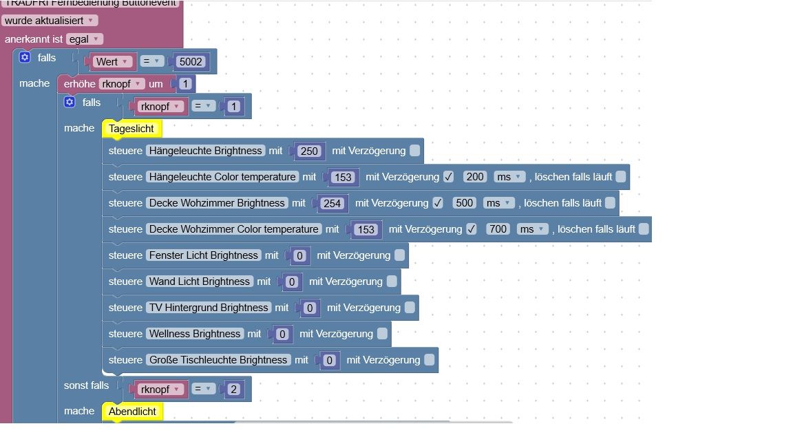 Ich benutze hier die runde Fernbedienung von Ikea. Den rechten Knopf benutze ich zum durchschalten verschiedene Licht Szenen (will das schon lange Per Szenen Adapter lösen).