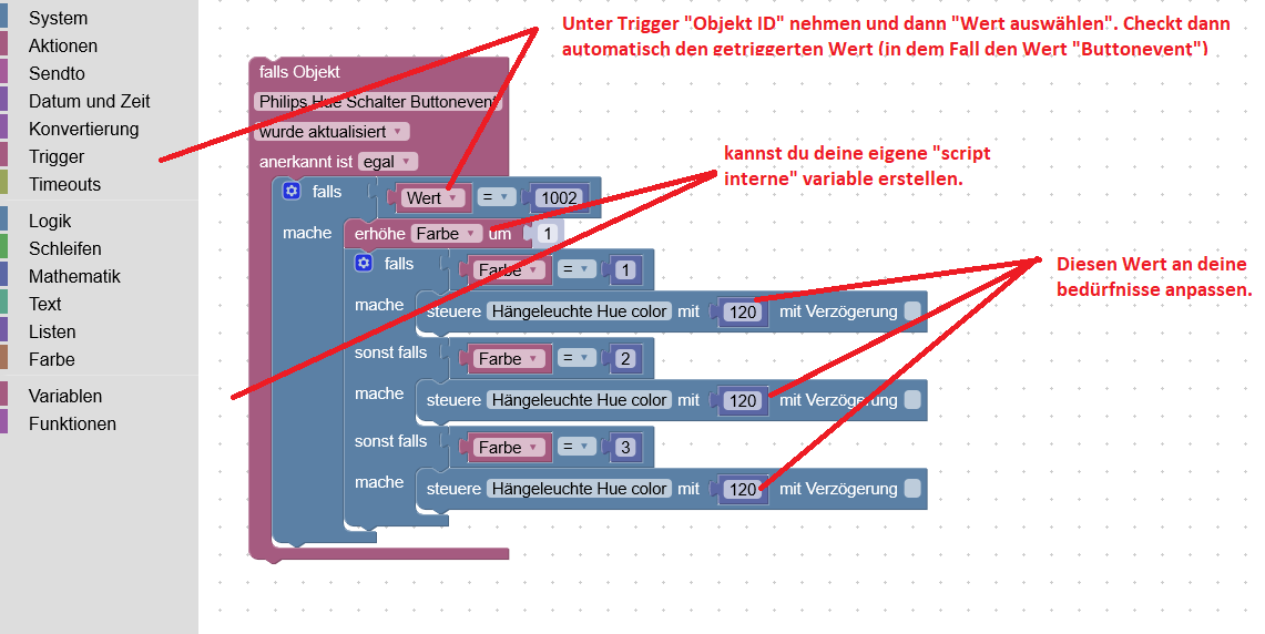 Damit erhöht er bei jedem Tastendruck (Buttonevent = 1002) den Wert "farbe um 1 und setzt somit automatisch den gewünschten Farbwert