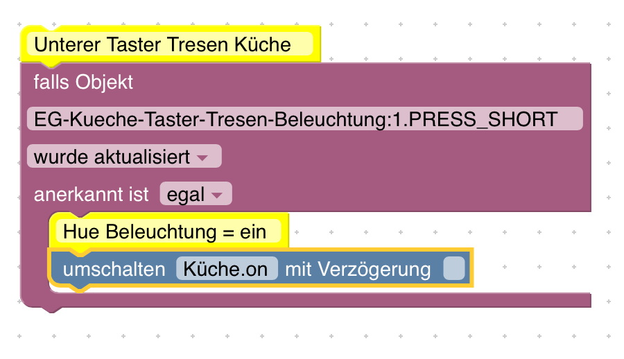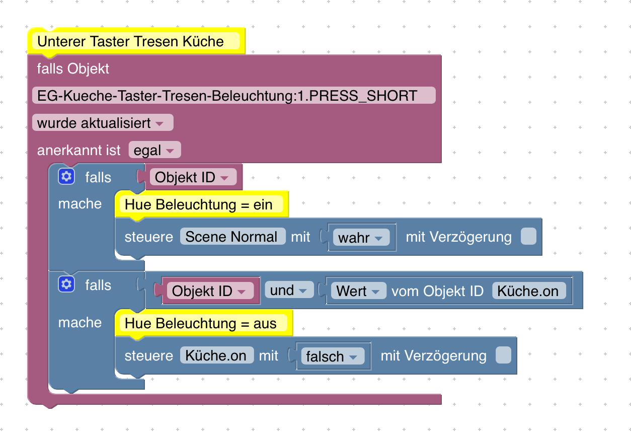 ich spiele nun seit einigen Wochen mit Blockly rum und habe auch schon ein paar funktionierende Skripte damit umgesetzt. Nun habe ich aber eine Verständnisfrage warum eine Blockkonstruktion so nicht läuft. Und zwar habe ich einen Homematic Taster der die Hue Beleuchtung in der Küche steuert. Der Taster ändert zwar nicht sein Status bei Tastendruck aber er wird aktualisiert damit kann ich arbeiten und das funktioniert super. Aber man lernt ja mit der Zeit und beginnt seine Blöcke zu optimieren. Ich wollte das alles jetzt in ein Fall - Sonst Falls Block packen wie auf dem ersten Bild zu sehen. So nimmt er aber bei Tastendruck immer nur das erste Falls und schaltet somit das Licht ein aber bei einen zweiten Tastendruck nicht aus. Mache ich jetzt aber einen zweiten Falls Block und packe den darunter zum ausschalten des Lichtes dann funktioniert das einwandfrei. Warum ist das so? Ist es im Prinzip nicht das gleiche wie im ersten Block mit dem Sonst Falls Block?