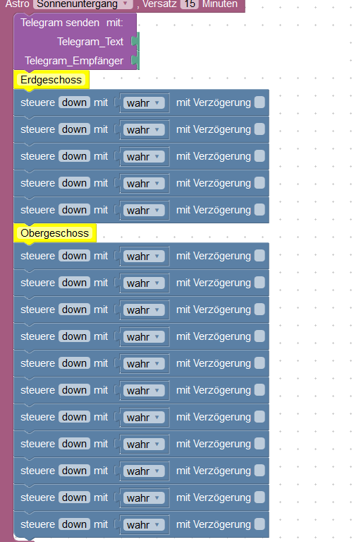 Nun habe ich aber schon seit längeren ein Blockly Skript laufen, welches das Öffnen und Schließen aller Rollläden morgens wie abends übernehmen soll, aber gerade dies macht mir Kopfzerbrechen.