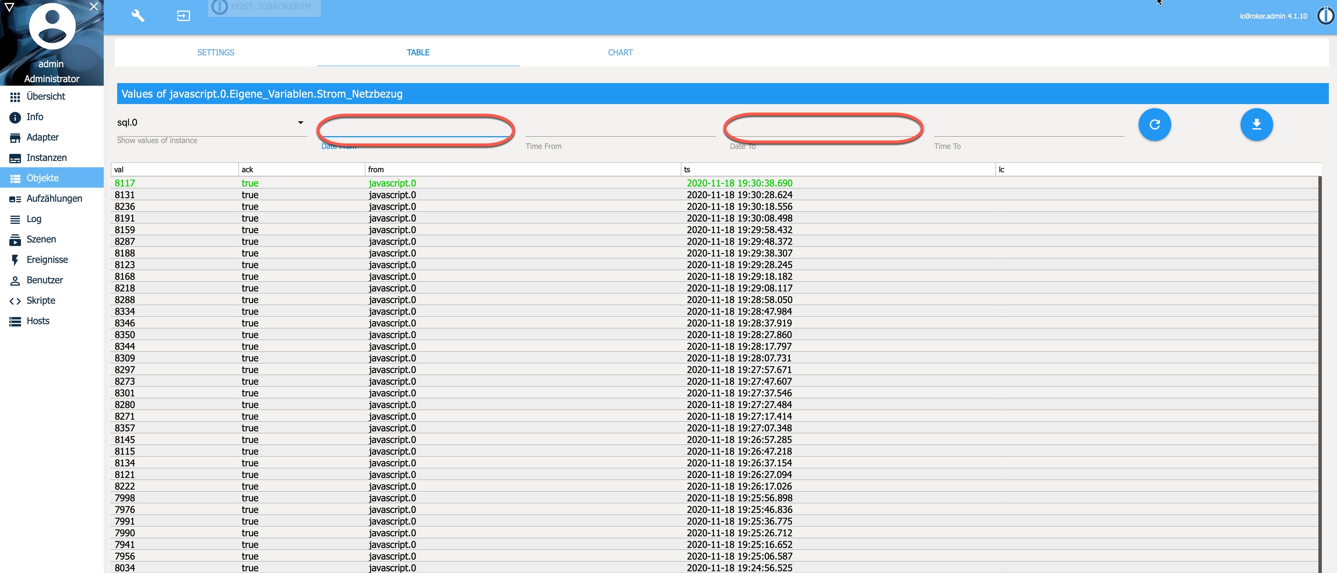 SQL-Adapter - Kein Datums-Picker / Chart im Datenpunkt?
