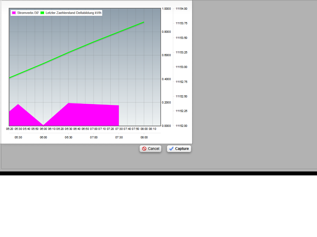 ich weiss jetzt nicht grad auf welches Beispiel Du Dich hier beziehst. Mein Verdacht geht nach einigen Tests in eine ganz andere Richtung. Irgendwas scheint mit Cron unsauber zu laufen. Nachdem ich das script eine Zeitlang ohne Eingriffe laufen liess, ergab sich folgendes Bilddabei fällt auf: h+00 und h+30 produzieren 0-Werte. Mittlerweile habe ich den modbus-adapter auf 3 Nachkommastellen eingestellt.