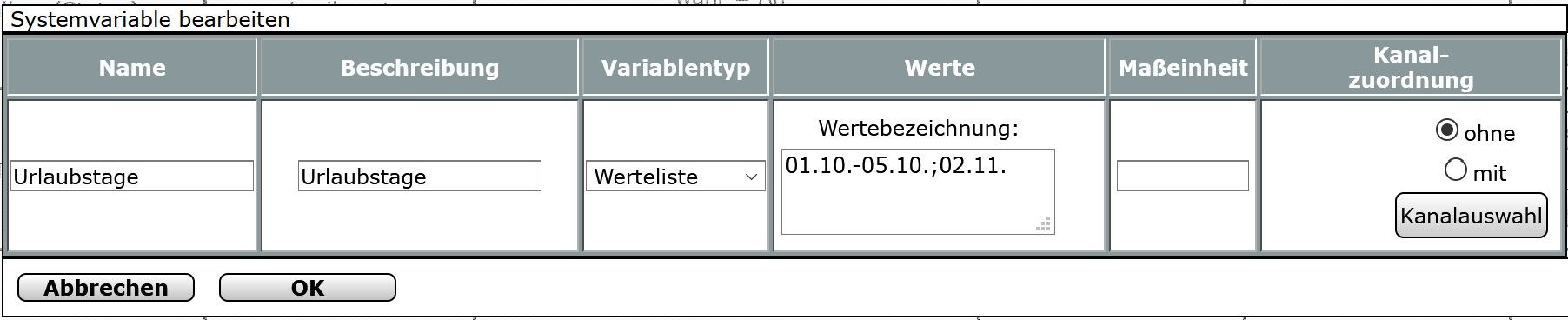 Im Homematic habe ich ein Script übernommen für die Urlaubstage. Die Werte werden in eine Werteliste geschrieben.