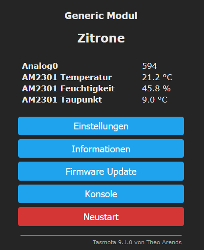 Auf der Weboberfläche zeigt er mir z.B. Die Werte für Temperatur/Feuchtigkeit und Taupunkt jeweils mit den richtigen Einheiten °C bzw % an: