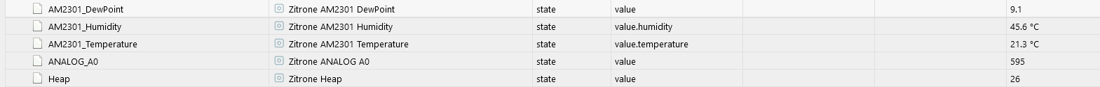 20:23:14 MQT: tele/Zitrone/SENSOR = {"Time":"2021-01-08T20:23:14","ANALOG":{"A0":595},"AM2301":{"Temperature":21.4,"Humidity":45.5,"DewPoint":9.1},"TempUnit":"C"}So ist das auch in der Tasmota Dou beschrieben (also 3 Werte und die Einheit "C").