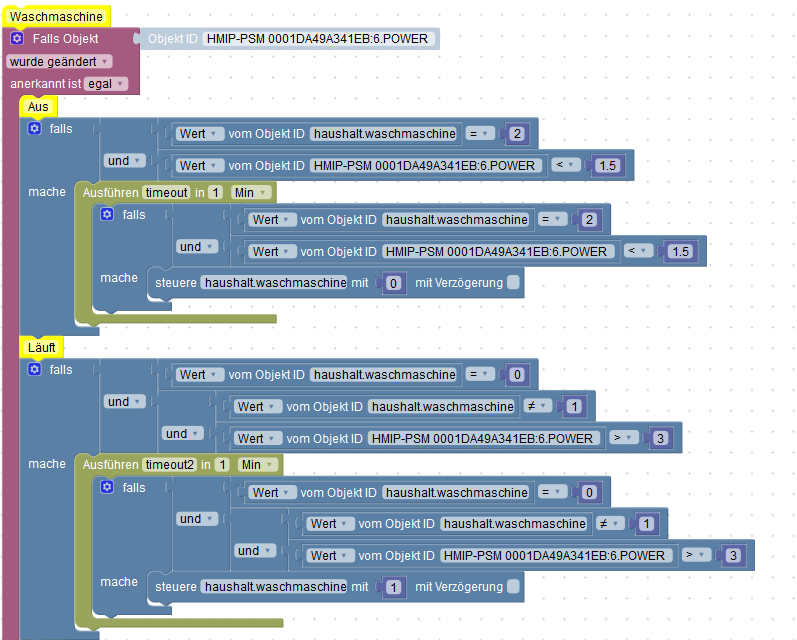 <statement name="DO0"> <block type="timeouts_settimeout" id=",NjGW@Wtt+n7RKNkcxK!"> <field name="NAME">timeout2</field> <field name="DELAY">5</field> <field name="UNIT">sec</field> <statement name="STATEMENT"> <block type="comment" id="wF!c?,7;T=c_:f5E$ca%"> <field name="COMMENT">Alexa Benachrichtung</field> <next> <block type="control" id="w3DS%f?P5Y+pO7;1V~SB"> <mutation xmlns="http://www.w3.org/1999/xhtml" delay_input="false"></mutation> <field name="OID">alexa2.0.Echo-Devices.5f894234bce346edbb4a1adce0045f99.Commands.speak</field> <field name="WITH_DELAY">FALSE</field> <value name="VALUE"> <block type="text" id="vtK95A?T0Tj#c5DEZ[5~"> <field name="TEXT">50;Hallo Waschmaschine hat seine Arbeit beendet </field> </block> </value> <next> <block type="comment" id="@dC$^axcVYkgm8#naev1"> <field name="COMMENT">Nachricht über Telegramm</field> <next> <block type="telegram" id=":)Sqh|eio_J%+h7Q@6nJ"> <field name="INSTANCE"></field> <field name="LOG"></field> <field name="SILENT">FALSE</field> <field name="PARSEMODE">default</field> <value name="MESSAGE"> <shadow xmlns="http://www.w3.org/1999/xhtml" type="text" id="zaE.r=+WylppU_4Nmdx~"> <field name="TEXT">Waschmaschine ist fertig</field> </shadow> <block type="text_join" id="3,~.TJZeugM.!B%S1^X}"> <mutation items="1"></mutation> <value name="ADD0"> <block type="text" id="|9?4%icsy2}Q088ry:q"> <field name="TEXT">💧💧💧 Die Waschmaschine ist Fertig. 💧💧💧</field> </block> </value> </block> </value> </block> </next> </block> </next> </block> </next> </block> </statement> -
