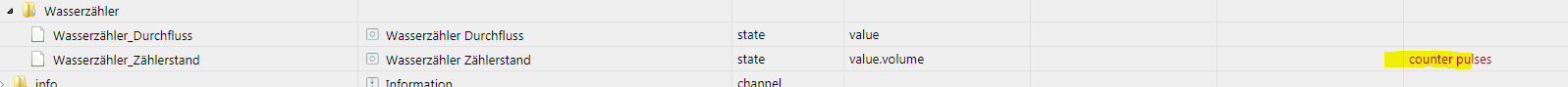 "common": { "name": "Volume (Instantaneous value)", "role": "value.volume", "unit": "m³", "read": true, "write": false, "custom": { "history.0": { "enabled": true, "changesOnly": true, "debounce": 0, "maxLength": "10", "retention": "31536000", "changesRelogInterval": 0, "changesMinDelta": 0, "aliasId": "" } } },Es fehlt common.type.