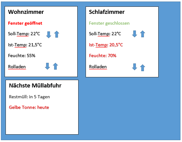 Also pro Zimmer eine Übersicht mit Temperaturen, Feuchte und Fensterzuständen. Zusätzlich Pfeile für Temperatureinstellung und Rolladen. Bei gewissen Zuständen (Fenster auf, Abweichung 1,5K von Solltemperatur etc..) soll sich die Schriftfarbe ändern.