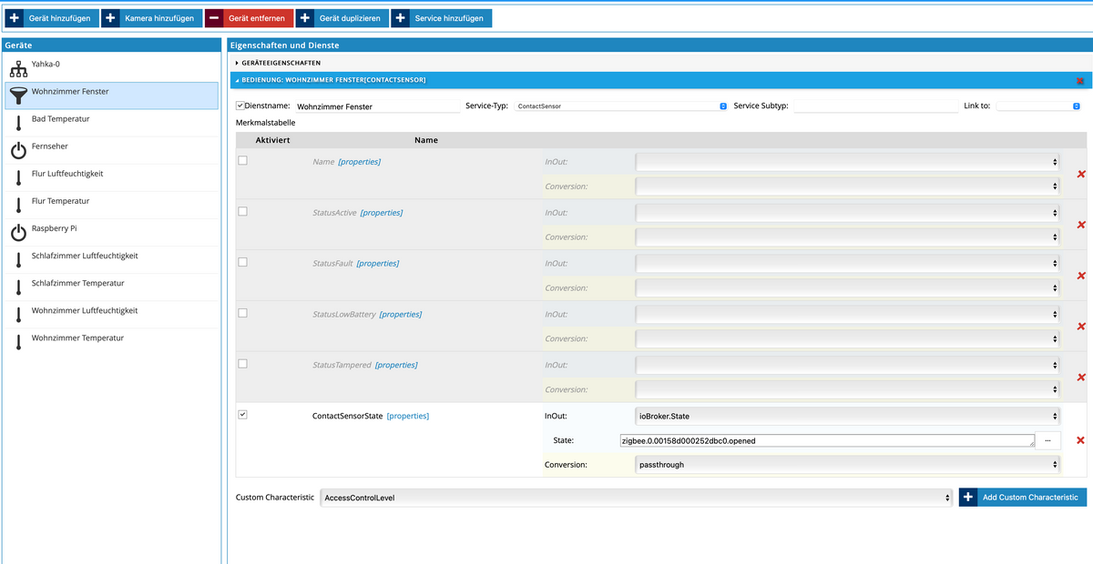 Bei Eigenschaften habe ich Sensor ausgewählt und als Service den "contact sensor"