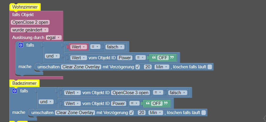 Baue ich den Sensor in einen Trigger, funktioniert das Skript nicht. Mache ich es ohne Trigger, geht es.Im folgendem Beispiel ist "OpenClose X open" der Sensor, "Power" und "Clear Zone Overlay" beides die Heizung.