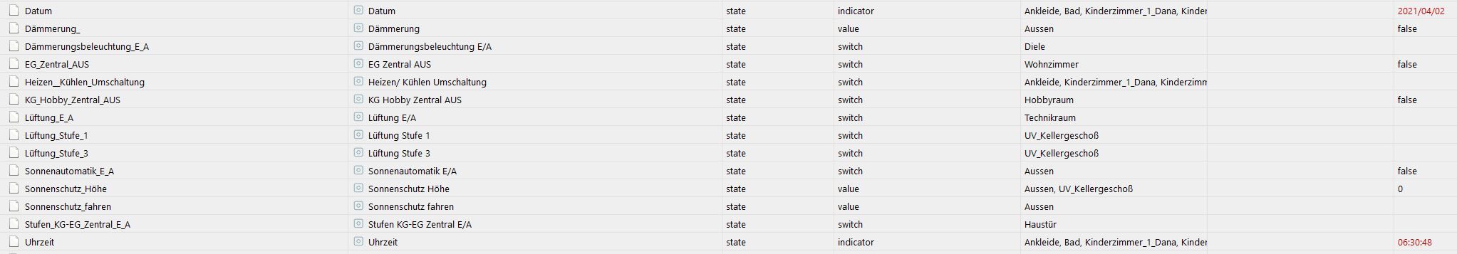 Interessanter war zwischenzeitlich ohne eine mir bewußte Einstellungsänderung auch einmal ein "vernünftiges" Datumsformat unterhalb der beiden "nodes" zu sehen (jezt steht da wieder ein großer ganzzahliger Wert). Unter den Objekten des iobrokers ist weiterhin ein "blank" - egal was sich da tut.