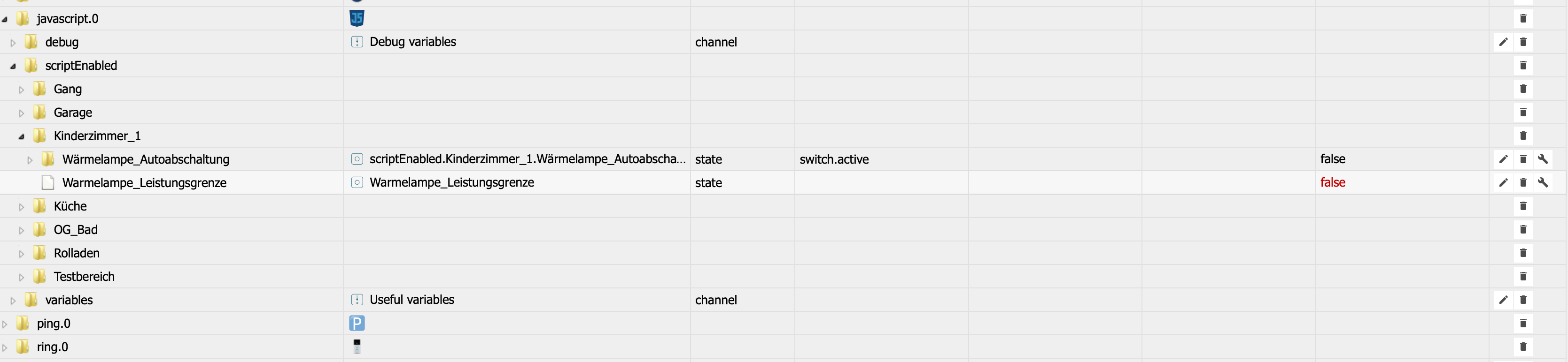 var timeout; on({id: 'homee.0.MeteringPlug-29.CurrentEnergyUse-275', change: "ne"}, async function (obj) { var value = obj.state.val; var oldValue = obj.oldState.val; if ((obj.state ? obj.state.val : "") > 100) { if (!timeout) { timeout = setTimeout(async function () { setState("homee.0.MeteringPlug-29.OnOff-269"/*OG Kind 1 FIBARO Wall Plug Gen5 Wärmelampe.OnOff*/, false); }, 25000); } } else { (function () {if (timeout) {clearTimeout(timeout); timeout = null;}})(); } });Es fehlen Zeilen 8, 12. Andernfalls laufen mehrere Timer, von denen nur einer gestoppt werden kann.