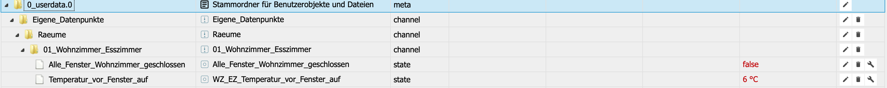 öffnet und schließt man jetzt die Fenster zum Test willkürlich hintereinander wird beim ersten Mal der Datenpunkt Alle Fenster geschlossen auch richtig auf falsch gesetzt und der aktuelle Wert, welcher vorher am Thermostat eingestellt war (beispielweise 18°C)), wird auch richtig in Temperatur vor Fenster auf geschrieben. geht nun aber in der Zwischenzeit der Status kurz auf Alle Fenster geschlossen auf True und der Timeout wird nochmal angestoßen, schreibt er dann, sobald der Wert alle Fenster geschlossen auf False geht nicht den vorherigen Wert, sondern die 6°C, was nicht stimmen kann. Ich hoffe ich habe das Thema jetzt nicht zu konfus hier aufgeschrieben...