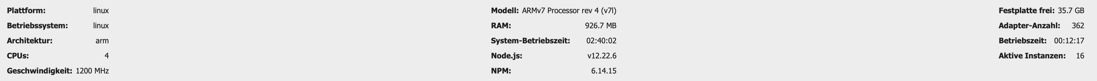 pi@Raspi:~ $ iobroker status Cannot read system.config: null (OK when migrating or restoring) Cannot find view "system" for search "host" iobroker is running on this host. Objects type: file States type: file pi@Raspi:~ $pi@Raspi:~ $ sudo apt update OK:1 http://archive.raspberrypi.org/debian buster InRelease OK:2 http://raspbian.raspberrypi.org/raspbian buster InRelease OK:3 https://deb.nodesource.com/node_12.x buster InRelease Paketlisten werden gelesen... Fertig Abhängigkeitsbaum wird aufgebaut. Statusinformationen werden eingelesen.... Fertig Alle Pakete sind aktuell. pi@Raspi:~ $pi@Raspi:~ $ sudo apt dist-upgrade Paketlisten werden gelesen... Fertig Abhängigkeitsbaum wird aufgebaut. Statusinformationen werden eingelesen.... Fertig Paketaktualisierung (Upgrade) wird berechnet... Fertig Die folgenden Pakete wurden automatisch installiert und werden nicht mehr benötigt: alsa-base emacs24 firmware-misc-nonfree firmware-ralink fontconfig-infinality g++-6 gnupg-agent gstreamer0.10-alsa gstreamer0.10-plugins-base libass5 libavcodec57 libavfilter6 libavformat57 libavresample3 libavutil55 libbabeltrace-ctf1 libbind9-140 libblas-common libbluetooth3 libbluray1 libboost-filesystem1.62.0 libboost-iostreams1.62.0 libboost-system1.62.0 libcdio-cdda1 libcdio-paranoia1 libcdio13 libcfitsio5 libdns-export162 libdns162 libdrm-freedreno1 libebur128-1 libevent-2.0-5 libgcr-3-common libgfortran3 libglew2.0 libgraphviz-dev libgstreamer-plugins-base0.10-0 libgstreamer0.10-0 libgvc6-plugins-gtk libgvpr2 libhunspell-1.4-0 libicu57 libilmbase12 libisc-export160 libisc160 libisccc140 libisccfg140 libjim0.76 liblab-gamut1 liblockfile-bin liblockfile1 liblwres141 libmagickcore-6.q16-3 libmagickcore-6.q16-3-extra libmagickwand-6.q16-3 libmpfr4 libnfs8 libopencv-calib3d2.4v5 libopencv-core2.4v5 libopencv-features2d2.4v5 libopencv-flann2.4v5 libopencv-highgui2.4-deb0 libopencv-imgproc2.4v5 libopencv-objdetect2.4v5 libopencv-video2.4v5 libopenexr22 libpackage-deprecationmanager-perl libpango1.0-0 libperl5.24 libpoppler64 libpostproc54 libprocps6 libpython3.5 libpython3.5-dev libpython3.5-minimal libpython3.5-stdlib libsndio6.1 libsodium18 libsrtp0 libssl1.0.2 libstdc++-6-dev libswresample2 libswscale4 libtiff5-dev libtxc-dxtn-s2tc0 libunbound2 libunistring0 libva-drm1 libva-x11-1 libva1 libvpx4 libvte-common libvte9 libwayland-egl1-mesa libwebpmux2 libx264-148 libx265-95 libxfce4util-bin libxfce4util-common libxfce4util7 libxfconf-0-2 lxplug-volume netsurf-common php7.0-intl php7.0-sqlite3 php7.0-xml pimixer point-rpi python-apt python-apt-common python3-pyasn1 python3.5 python3.5-dev python3.5-minimal rename rsync sgml-base tla tla-doc xfconf xml-core Verwenden Sie »sudo apt autoremove«, um sie zu entfernen. 0 aktualisiert, 0 neu installiert, 0 zu entfernen und 0 nicht aktualisiert. pi@Raspi:~ $@accu sagte in ioBroker lässt sich nicht upgraden: