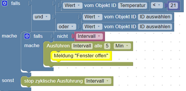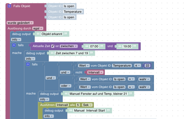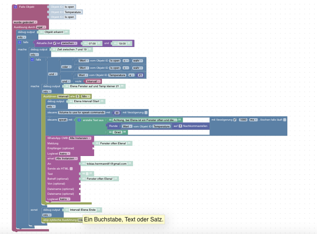 Wenn ich ein Fenster öffne, wird dies erkannt, die Uhrzeit geprüft, dann die Temperatur geprüft (Wert kleiner 21) -> Meldung erfolgt.