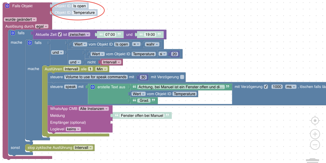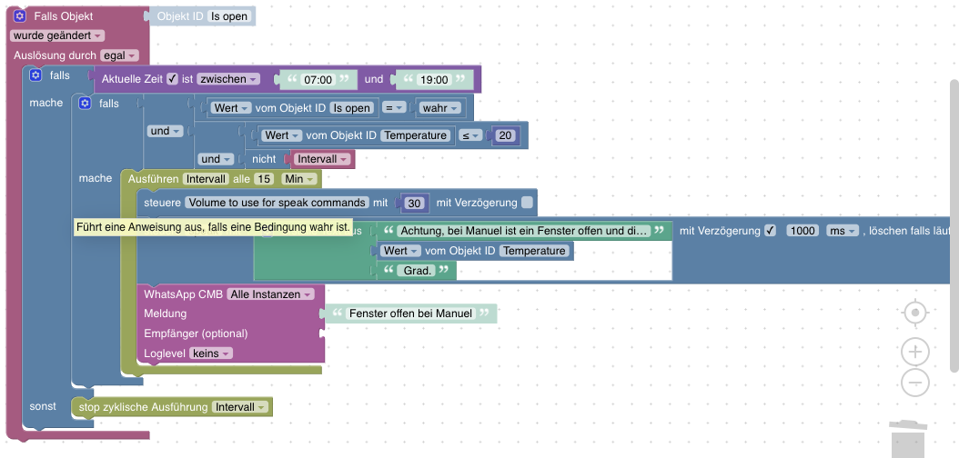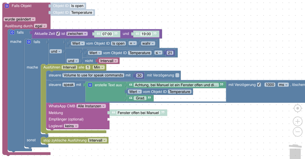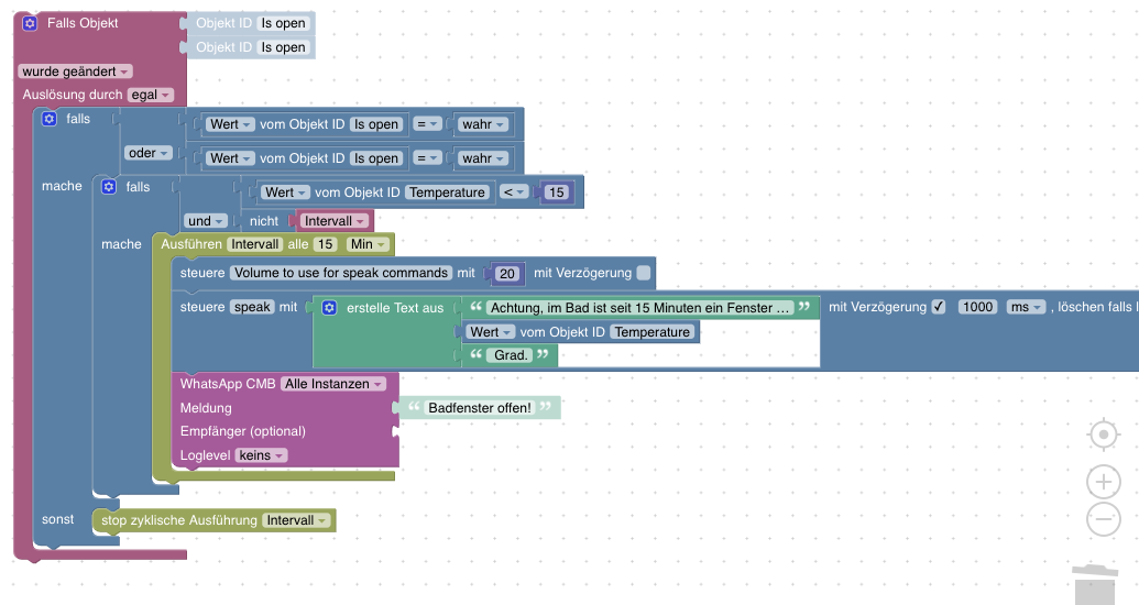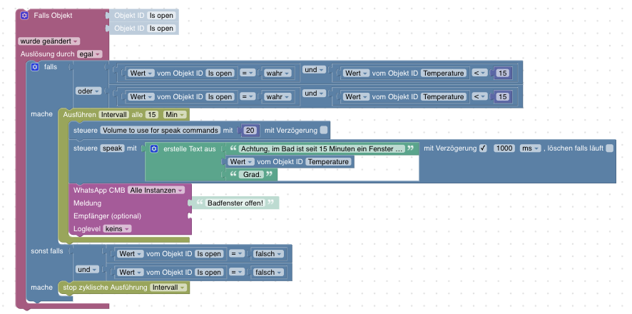 <xml xmlns="https://developers.google.com/blockly/xml"> <variables> <variable type="interval" id="Intervall">Intervall</variable> </variables> <block type="on_ext" id="|dH|olOMYVn~H%Jn|nyS" x="-487" y="-87"> <mutation xmlns="http://www.w3.org/1999/xhtml" items="2"></mutation> <field name="CONDITION">ne</field> <field name="ACK_CONDITION"></field> <value name="OID0"> <shadow type="field_oid" id="Nk5ABz@dhUhd8bYqb7IE"> <field name="oid">zigbee.0.00158d0006d416f7.opened</field> </shadow> </value> <value name="OID1"> <shadow type="field_oid" id="bR^W?^XUx~f2ep-bReP."> <field name="oid">zigbee.0.00158d0006d6892c.opened</field> </shadow> </value> <statement name="STATEMENT"> <block type="controls_if" id="]6NmY5Arm*oC(/C4C9fx"> <mutation else="1"></mutation> <value name="IF0"> <block type="logic_operation" id="?9`npQFK0yr$J{g7m,qy" inline="false"> <field name="OP">OR</field> <value name="A"> <block type="logic_compare" id="ir8%O$UIa_2vun^eR:gs"> <field name="OP">EQ</field> <value name="A"> <block type="get_value" id="-#)apV4ko?9bjc34q,cp"> <field name="ATTR">val</field> <field name="OID">zigbee.0.00158d0006d416f7.opened</field> </block> </value> <value name="B"> <block type="logic_boolean" id="E_QD2`tR^rij]xRveiSk"> <field name="BOOL">TRUE</field> </block> </value> </block> </value> <value name="B"> <block type="logic_compare" id="fIzAp1iVwg3QXon;T]eV"> <field name="OP">EQ</field> <value name="A"> <block type="get_value" id="K;LAH/JOXy:Pz2gWPtw8"> <field name="ATTR">val</field> <field name="OID">zigbee.0.00158d0006d6892c.opened</field> </block> </value> <value name="B"> <block type="logic_boolean" id="f,3g-P=S_+71(~v9@)Q9"> <field name="BOOL">TRUE</field> </block> </value> </block> </value> </block> </value> <statement name="DO0"> <block type="controls_if" id="WdB*x=Yb1s5`s%1;8sb8"> <value name="IF0"> <block type="logic_operation" id="=!,%0^7{Nr,#RGpgyjbO" inline="false"> <field name="OP">AND</field> <value name="A"> <block type="logic_compare" id="oAm7uGv*1hz~!d7h.+7|"> <field name="OP">LT</field> <value name="A"> <block type="get_value" id="4Q+ym)29|XcJ)|[}nB^e"> <field name="ATTR">val</field> <field name="OID">weatherunderground.0.forecast.current.temp</field> </block> </value> <value name="B"> <block type="math_number" id="=DyNr]:#+Kvba%|LYfs%"> <field name="NUM">15</field> </block> </value> </block> </value> <value name="B"> <block type="logic_negate" id="#rF.Zz_,)nYa)iDBk9y+"> <value name="BOOL"> <block type="variables_get" id="-NmcPMz/A)TI;vo+w:KC"> <field name="VAR" id="Intervall" variabletype="interval">Intervall</field> </block> </value> </block> </value> </block> </value> <statement name="DO0"> <block type="timeouts_setinterval" id="7%/Ll?G,CpruwYL_;RTc"> <field name="NAME">Intervall</field> <field name="INTERVAL">15</field> <field name="UNIT">min</field> <statement name="STATEMENT"> <block type="control" id="l/2nAsk,Yq0HEsysAzGu"> <mutation xmlns="http://www.w3.org/1999/xhtml" delay_input="false"></mutation> <field name="OID">alexa2.0.Echo-Devices.G090U50990850U2X.Commands.speak-volume</field> <field name="WITH_DELAY">FALSE</field> <value name="VALUE"> <block type="math_number" id="Pi-hhOCBN(6E`C7=3fS1"> <field name="NUM">20</field> </block> </value> <next> <block type="control" id="j*|p}Jx{9cW6+-.IqSSx"> <mutation xmlns="http://www.w3.org/1999/xhtml" delay_input="true"></mutation> <field name="OID">alexa2.0.Echo-Devices.G090U50990850U2X.Commands.speak</field> <field name="WITH_DELAY">TRUE</field> <field name="DELAY_MS">1000</field> <field name="UNIT">ms</field> <field name="CLEAR_RUNNING">FALSE</field> <value name="VALUE"> <block type="text_join" id="!xmEaZVK3x;(p,#-.3~y" inline="false"> <mutation items="3"></mutation> <value name="ADD0"> <block type="text" id="c:zqL~*PW9u]u6e8a$*1"> <field name="TEXT">Achtung, im Bad ist seit 15 Minuten ein Fenster offen und die Außentemperatur beträgt </field> </block> </value> <value name="ADD1"> <block type="get_value" id="Fv;Xty[=-uMXc3v@U?%)"> <field name="ATTR">val</field> <field name="OID">weatherunderground.0.forecast.current.temp</field> </block> </value> <value name="ADD2"> <block type="text" id="MUm7dd#|B~9ZAMH}qLZM"> <field name="TEXT"> Grad.</field> </block> </value> </block> </value> <next> <block type="whatsapp-cmb" id=".IiKmKd(09qzP}**y#S|"> <field name="INSTANCE"></field> <field name="LOG"></field> <value name="MESSAGE"> <shadow type="text" id="GXbO@][G8;9C9qXL#jMx"> <field name="TEXT">Badfenster offen!</field> </shadow> </value> </block> </next> </block> </next> </block> </statement> </block> </statement> </block> </statement> <statement name="ELSE"> <block type="timeouts_clearinterval" id="g!d_u2QD0J@cFB#%4,@-"> <field name="NAME">Intervall</field> </block> </statement> </block> </statement> </block> </xml> -