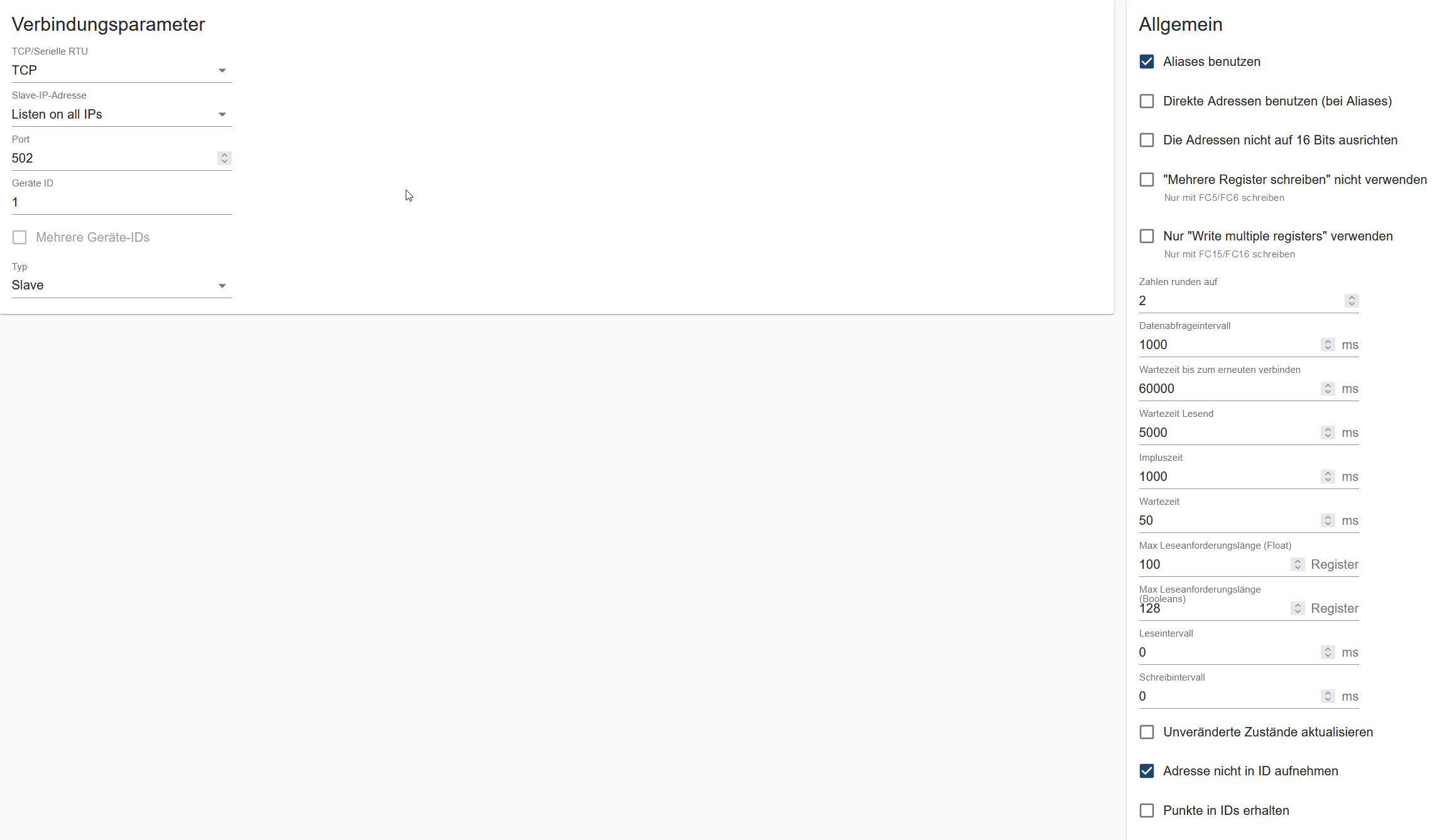 Liegt das Problem bei mir, mache ich einen Fehler oder ist hier der Slave Mode (Server) in Bezug auf die Holdingregister verbuggt?Systemdata Hardwaresystem: HP ProLiant MicroServer N54L Arbeitsspeicher: 16GB Festplattenart: SSD Betriebssystem: Ubuntu 20.04.3 LTS Node-Version: 12.22.7 Nodejs-Version: 12.22.7 NPM-Version: 6.14.15 Installationsart: Manuell Image genutzt: Nein -
