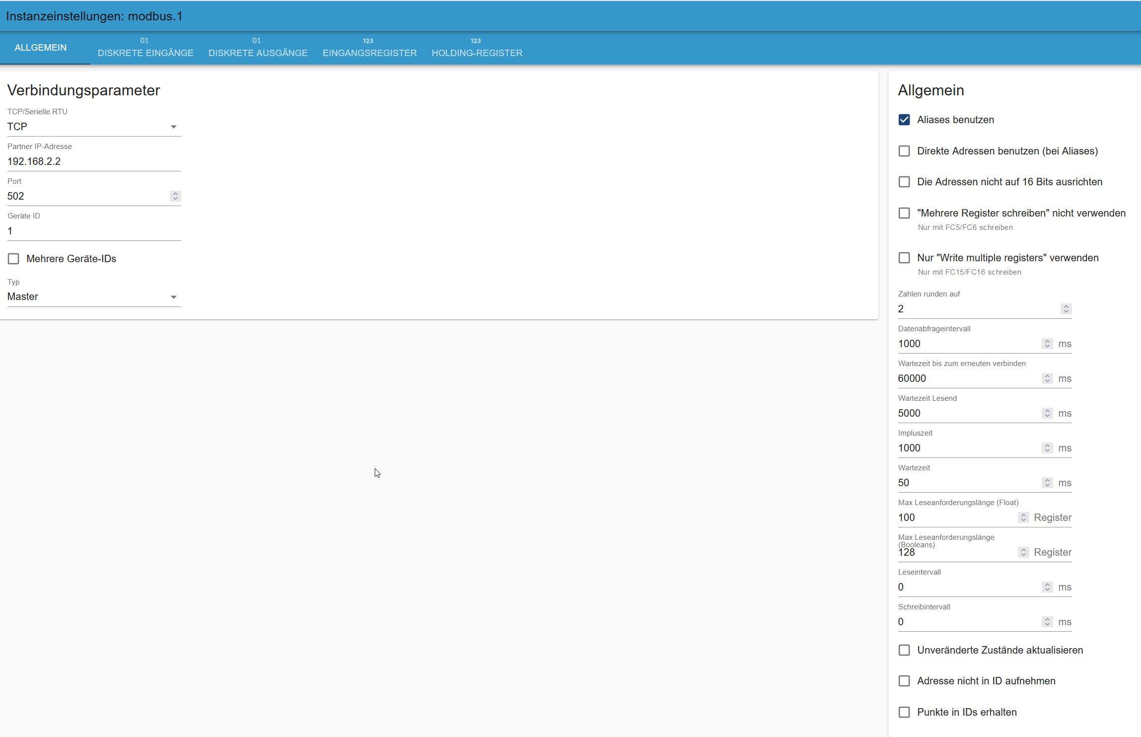2 Instanzen installiert: Adapter Modbus Version 3.4.14