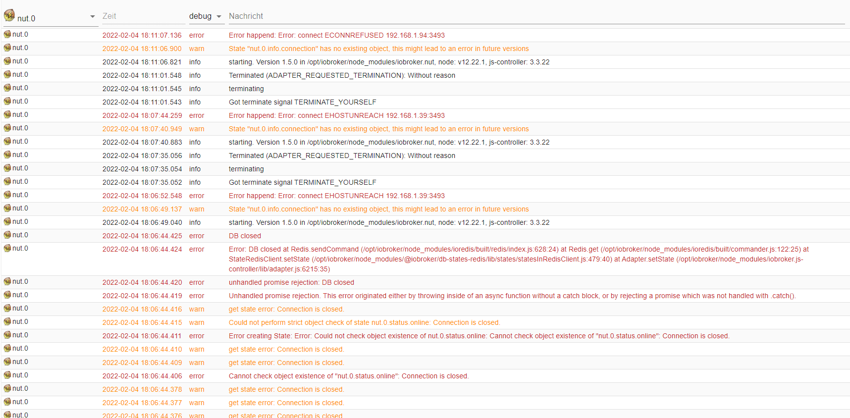 Last login: Fri Feb 4 17:42:08 2022 from 192.168.1.28 xxx@stromversorgung:~$ sudo systemctl restart nut-client [sudo] password for xxx: Job for nut-monitor.service failed because the control process exited with error code. See "systemctl status nut-monitor.service" and "journalctl -xe" for details.@smart_home sagte in [UPS] Network UPS Adapter - Fehlermeldungen: