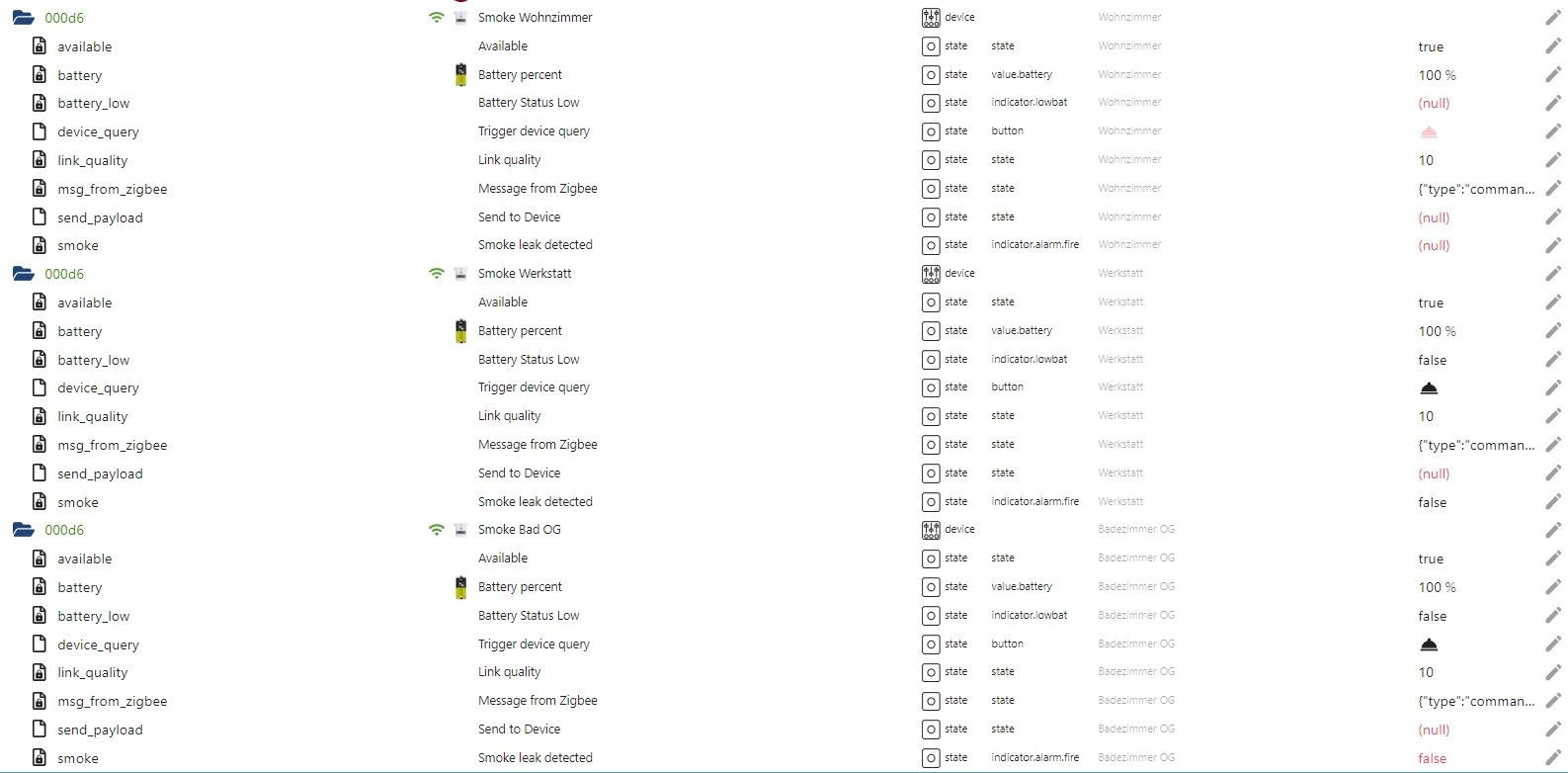 Jedoch: Mir ist aufgefallen, dass die Rauchmelder sonst keine Daten übertragen. Keinen Batteriezustand - nichts. Ich werte seit einiger Zeit die Zeitstempel aus - da tut sich nichts.
