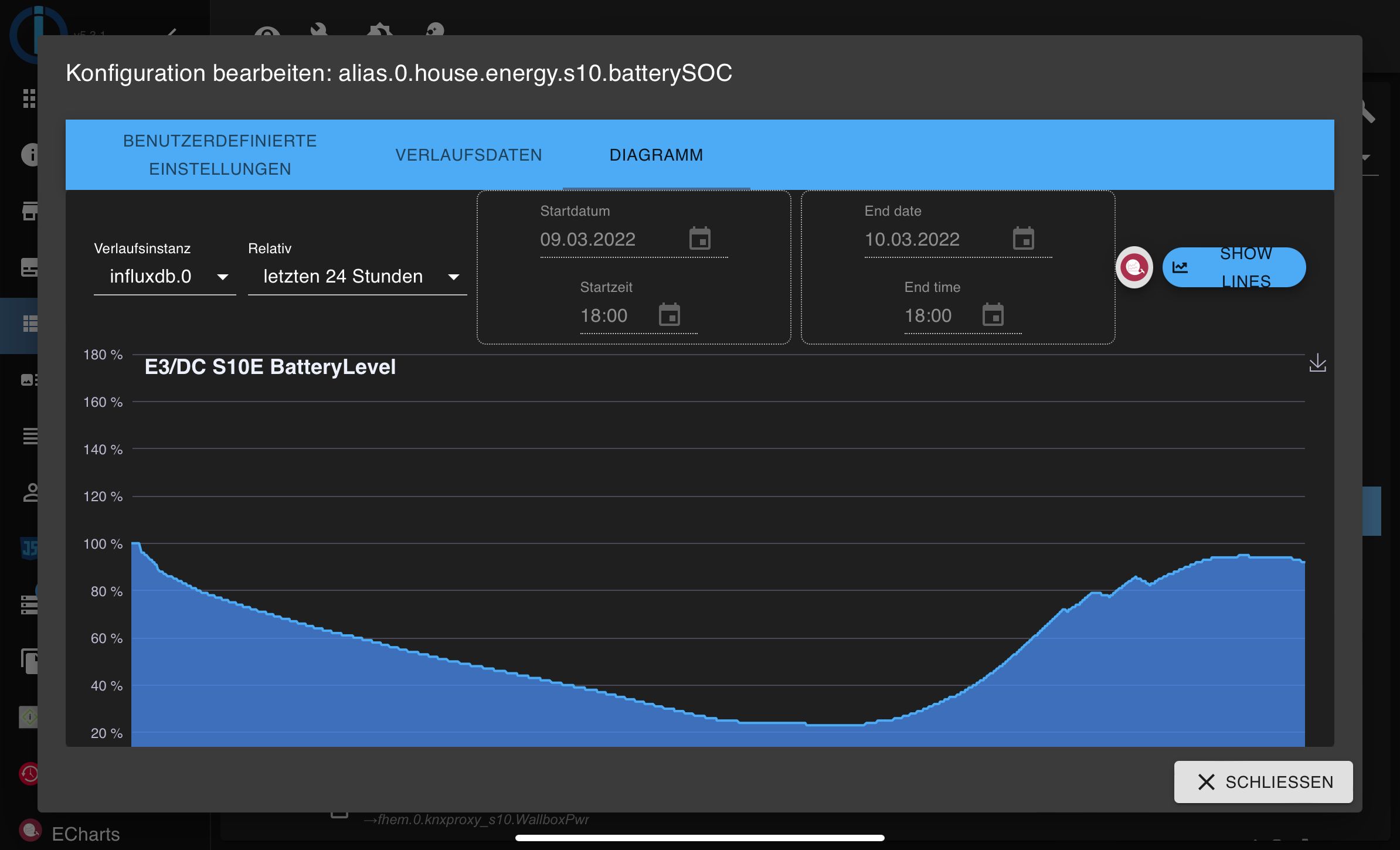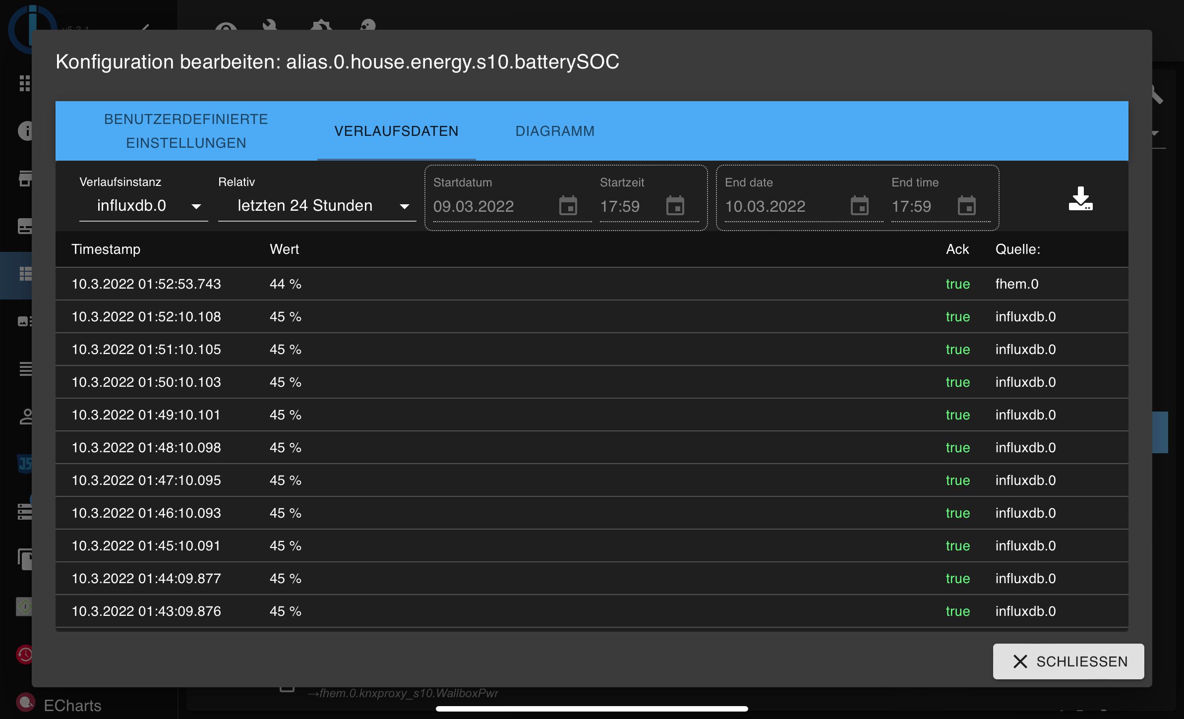 <iobroker>:8087/query/alias.0.house.energy.s10.batterySOC/?dateFrom=2022-03-09T12:27:25.605Z&dateTo=2022-03-10T12:27:25.605Z würde ich Daten für einen vollen Tag erwarten.
