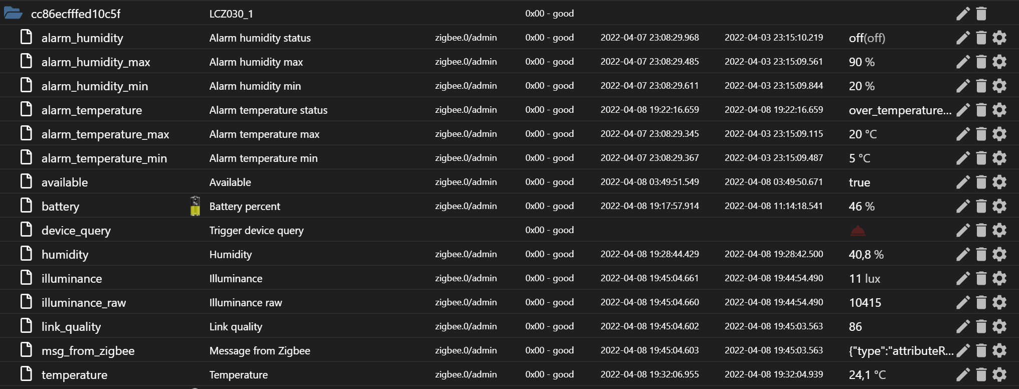 pegelalarm.0 2022-05-18 21:36:13.472 info Terminated (NO_ERROR): Without reason pegelalarm.0 2022-05-18 21:36:13.472 debug Plugin sentry destroyed pegelalarm.0 2022-05-18 21:36:13.428 debug cleaned everything up... pegelalarm.0 2022-05-18 21:36:13.171 debug Check for deleting old states is started pegelalarm.0 2022-05-18 21:36:13.170 debug ##### currentStations 2: schwaighofbrücke,obergaeu ##### pegelalarm.0 2022-05-18 21:36:13.169 debug ##### currentStations 6: schwaighofbrücke,obergaeu ##### pegelalarm.0 2022-05-18 21:36:13.169 debug Pegelalarm Request is completed pegelalarm.0 2022-05-18 21:36:10.167 debug Pegelalarm request for measuring station 2 is finish ... pegelalarm.0 2022-05-18 21:36:10.166 debug Pegelalarm request done pegelalarm.0 2022-05-18 21:36:07.731 debug ##### currentStations 1: schwaighofbrücke,obergaeu ##### pegelalarm.0 2022-05-18 21:36:07.587 debug Pegelalarm API is available ... Status: 200 pegelalarm.0 2022-05-18 21:36:07.428 debug https://api.pegelalarm.at/api/station/1.0/list?countryCode=AT&qWater=Lammer&qStationName=Obergaeu pegelalarm.0 2022-05-18 21:36:07.428 debug Pegelalarm request for measuring station 2 is started ... pegelalarm.0 2022-05-18 21:36:06.426 debug Pegelalarm request for measuring station 1 is finish ... pegelalarm.0 2022-05-18 21:36:06.425 debug Pegelalarm request done pegelalarm.0 2022-05-18 21:36:04.199 debug ##### currentStations 1: schwaighofbrücke ##### pegelalarm.0 2022-05-18 21:36:04.062 debug Pegelalarm API is available ... Status: 200 pegelalarm.0 2022-05-18 21:36:03.806 debug https://api.pegelalarm.at/api/station/1.0/list?countryCode=AT&qWater=Lammer&qStationName=Schwaighofbr%C3%BCcke pegelalarm.0 2022-05-18 21:36:03.804 debug Pegelalarm request for measuring station 1 is started ... pegelalarm.0 2022-05-18 21:36:03.767 info starting. Version 1.2.7 (non-npm: simatec/ioBroker.pegelalarm) in /opt/iobroker/node_modules/iobroker.pegelalarm, node: v14.19.0, js-controller: 4.0.15 pegelalarm.0 2022-05-18 21:36:03.272 debug Plugin sentry Initialize Plugin (enabled=true) pegelalarm.0 2022-05-18 21:26:12.565 info Terminated (NO_ERROR): Without reason pegelalarm.0 2022-05-18 21:26:12.564 debug Plugin sentry destroyed pegelalarm.0 2022-05-18 21:26:12.514 debug cleaned everything up... pegelalarm.0 2022-05-18 21:26:12.231 debug Check for deleting old states is started pegelalarm.0 2022-05-18 21:26:12.230 debug ##### currentStations 2: schwaighofbrücke,obergaeu ##### pegelalarm.0 2022-05-18 21:26:12.229 debug ##### currentStations 6: schwaighofbrücke,obergaeu ##### pegelalarm.0 2022-05-18 21:26:12.229 debug Pegelalarm Request is completed pegelalarm.0 2022-05-18 21:26:09.228 debug Pegelalarm request for measuring station 2 is finish ... pegelalarm.0 2022-05-18 21:26:09.228 debug Pegelalarm request done pegelalarm.0 2022-05-18 21:26:07.057 debug ##### currentStations 1: schwaighofbrücke,obergaeu ##### pegelalarm.0 2022-05-18 21:26:06.915 debug Pegelalarm API is available ... Status: 200 pegelalarm.0 2022-05-18 21:26:06.754 debug https://api.pegelalarm.at/api/station/1.0/list?countryCode=AT&qWater=Lammer&qStationName=Obergaeu pegelalarm.0 2022-05-18 21:26:06.754 debug Pegelalarm request for measuring station 2 is started ... pegelalarm.0 2022-05-18 21:26:05.752 debug Pegelalarm request for measuring station 1 is finish ... pegelalarm.0 2022-05-18 21:26:05.751 debug Pegelalarm request done pegelalarm.0 2022-05-18 21:26:03.586 debug ##### currentStations 1: schwaighofbrücke ##### pegelalarm.0 2022-05-18 21:26:03.424 debug Pegelalarm API is available ... Status: 200 pegelalarm.0 2022-05-18 21:26:03.141 debug https://api.pegelalarm.at/api/station/1.0/list?countryCode=AT&qWater=Lammer&qStationName=Schwaighofbr%C3%BCcke pegelalarm.0 2022-05-18 21:26:03.138 debug Pegelalarm request for measuring station 1 is started ... pegelalarm.0 2022-05-18 21:26:03.096 info starting. Version 1.2.7 (non-npm: simatec/ioBroker.pegelalarm) in /opt/iobroker/node_modules/iobroker.pegelalarm, node: v14.19.0, js-controller: 4.0.15 pegelalarm.0 2022-05-18 21:26:02.559 debug Plugin sentry Initialize Plugin (enabled=true) pegelalarm.0 2022-05-18 21:26:02.164 debug States connected to redis: 127.0.0.1:9000 pegelalarm.0 2022-05-18 21:26:02.038 debug States create User PubSub Client pegelalarm.0 2022-05-18 21:26:02.036 debug States create System PubSub Client pegelalarm.0 2022-05-18 21:26:01.947 debug Redis States: Use Redis connection: 127.0.0.1:9000 pegelalarm.0 2022-05-18 21:26:01.869 debug Objects connected to redis: 127.0.0.1:9001 pegelalarm.0 2022-05-18 21:26:01.863 debug Objects client initialize lua scripts pegelalarm.0 2022-05-18 21:26:01.673 debug Objects create User PubSub Client pegelalarm.0 2022-05-18 21:26:01.672 debug Objects create System PubSub Client pegelalarm.0 2022-05-18 21:26:01.670 debug Objects client ready ... initialize now pegelalarm.0 2022-05-18 21:26:01.588 debug Redis Objects: Use Redis connection: 127.0.0.1:9001 -