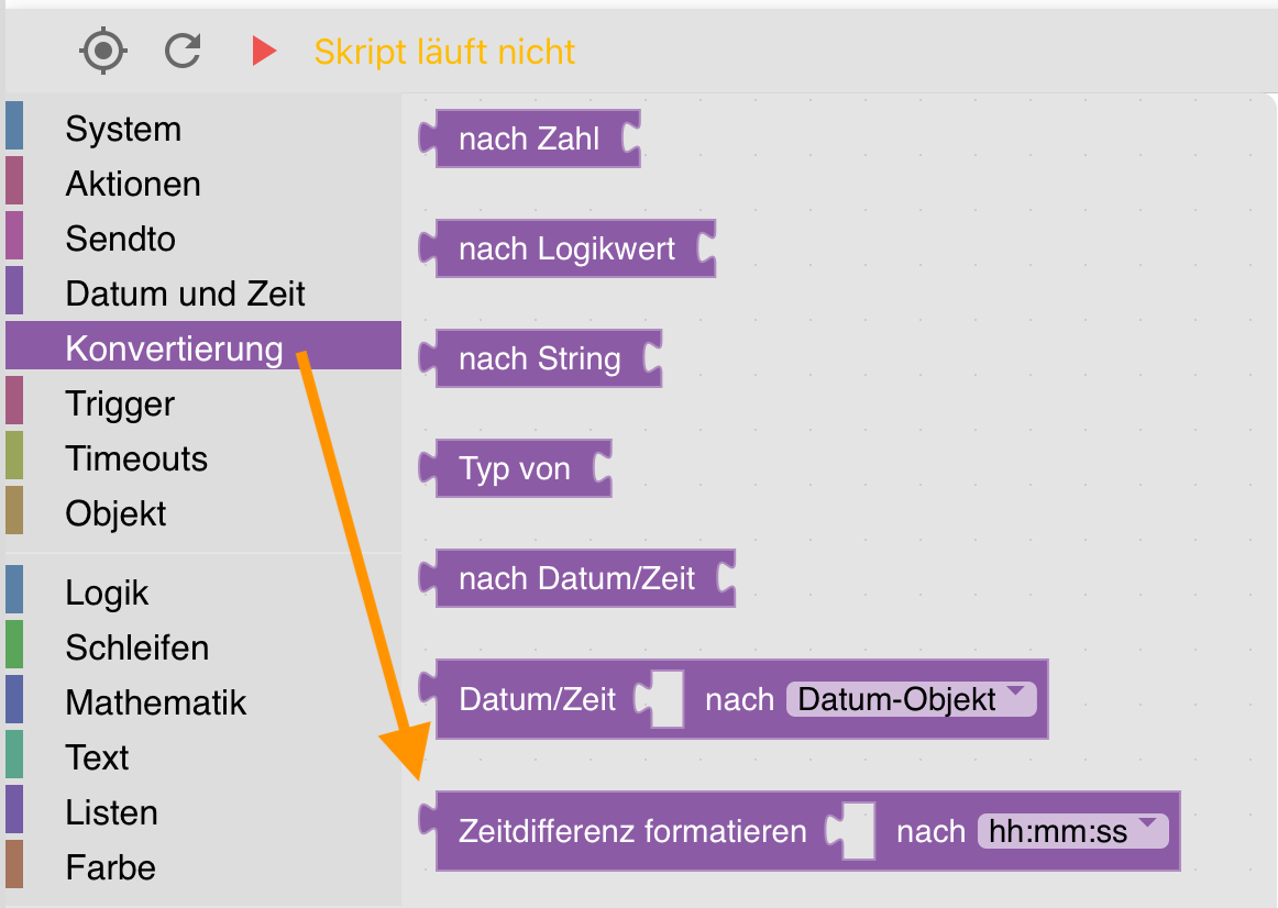 wie muss ich das anstellen, dass ein Datenpunkt (unter Objekte / 0_userdata) ausgelesen (zB diese 300000ms), dann umgerechnet werden, dass 00:05:00 ausgeben und dies wieder in ein Datenpunkt (wieder unter Objekte / 0_userdata) reingeschrieben wird? - Mir raucht echt schon der Kopf davon...