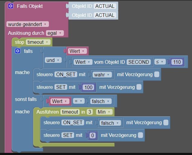 • der stop TimeOutBegungsmelder1 ... naja, eine Gefahr ist immer das man was baut was sich hundert mal aufruft und dann hundert mal einen Timeout startet, da setzte ich immer sicherheitshalber ein Stop.