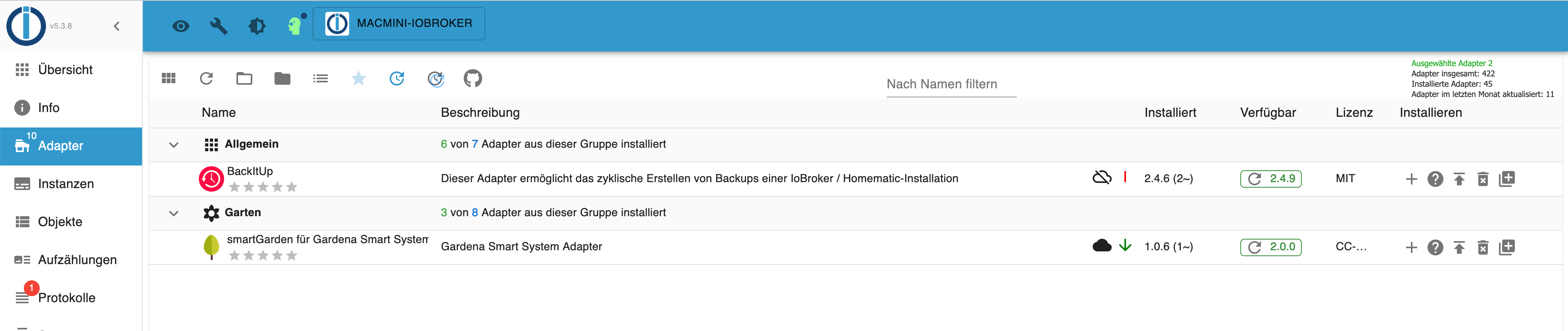 ein gaaaanz anderes Bild:Used repository: stable Adapter "backitup" : 2.4.9 , installed 2.4.6 [Updatable] Adapter "devices" : 1.0.12 , installed 1.0.10 [Updatable] Adapter "email" : 1.1.3 , installed 1.0.10 [Updatable] Adapter "flot" : 1.11.0 , installed 1.10.7 [Updatable] Adapter "homekit-controller": 0.5.1, installed 0.4.4 [Updatable] Controller "js-controller": 4.0.23 , installed 4.0.21 [Updatable] Adapter "node-red" : 3.3.1 , installed 3.3.0 [Updatable] Adapter "simple-api" : 2.7.0 , installed 2.6.5 [Updatable] Adapter "smartgarden" : 2.0.0 , installed 1.0.6 [Updatable] Adapter "telegram" : 1.13.0 , installed 1.12.6 [Updatable] Adapter "terminal" : 0.2.6 , installed 0.2.5 [Updatable]Die tauchen aber in der Liste (Filteradapter) nicht auf?