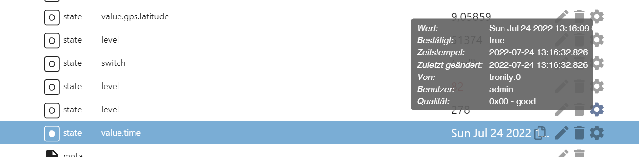 In den Objekten wird dabei der Timestamp als value.time Sun Jul 24 2022 13:16:09 GMT+0200 (Mitteleuropäische Sommerzeit) angezeigt: