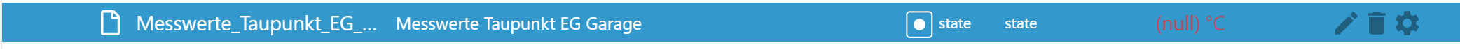 { "_id": "openknx.0.Messwerte.Messwerte_Taupunkt.Messwerte_Taupunkt_EG_Garage", "type": "state", "common": { "desc": "Basetype: 16-bit floating point value", "name": "Messwerte Taupunkt EG Garage", "read": true, "role": "state", "type": "number", "unit": "°C", "write": true }, "native": { "address": "0/2/20", "answer_groupValueResponse": false, "autoread": true, "bitlength": 16, "dpt": "DPT9.001", "valuetype": "basic" }, "from": "system.adapter.openknx.0", "user": "system.user.admin", "ts": 1658155390405 }{ "_id": "openknx.0.Messwerte.Messwerte_Taupunkt.Messwerte_Taupunkt_KG_Garage", "type": "state", "common": { "desc": "Basetype: 16-bit floating point value", "name": "Messwerte Taupunkt KG Garage", "read": true, "role": "state", "type": "number", "unit": "°C", "write": true }, "native": { "address": "0/2/9", "answer_groupValueResponse": false, "autoread": true, "bitlength": 16, "dpt": "DPT9.001", "valuetype": "basic" }, "from": "system.adapter.openknx.0", "user": "system.user.admin", "ts": 1658155390327 }Im Protokoll wird nichts aufgeführt.