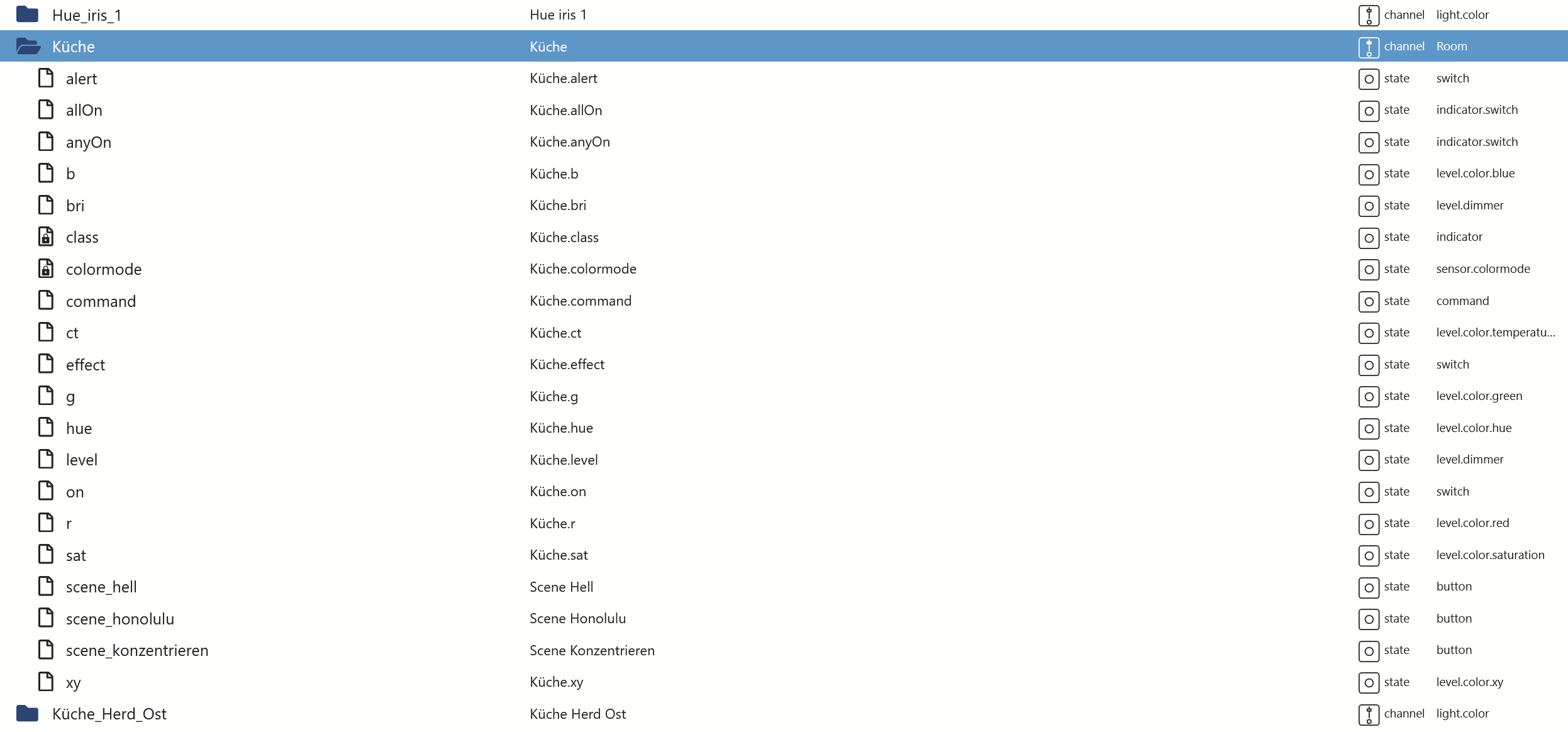 Wenn ich in die Objekte schaue sind alle Lampen und Räume aufgelistet.