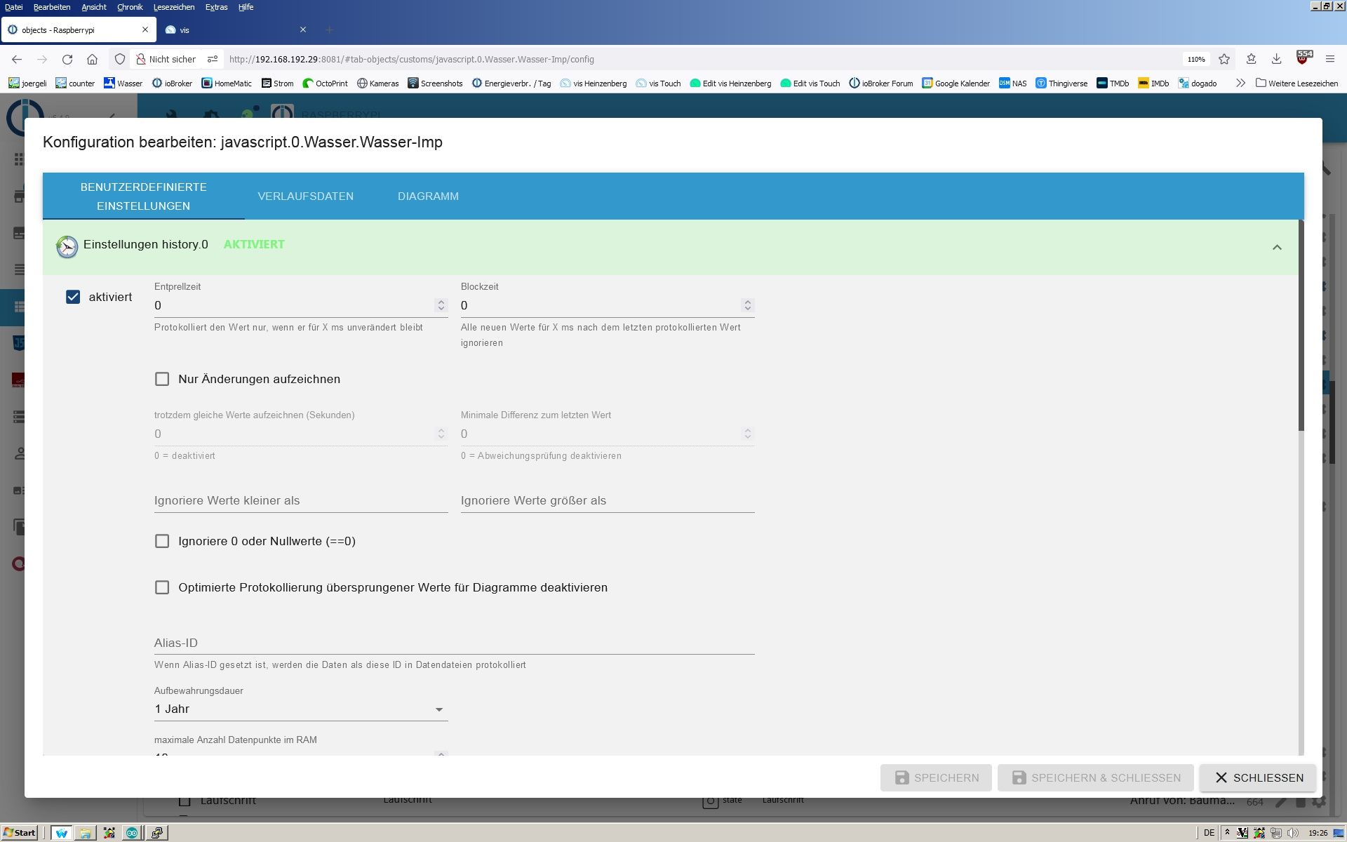 Diesen Datenpunkt logge ich mit dem history-Adapter, was auch funktioniert ( "Nur Änderungen aufzeichnen" nicht angehakt, da ja immer wieder "5 l" gesendet werden).