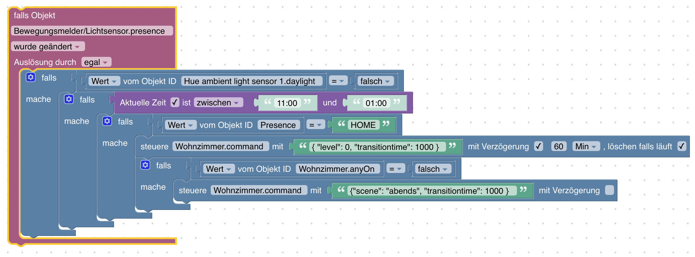 var manuell_aus; on({id: [].concat(['hue.0.Bewegungsmelder/Lichtsensor.presence']), change: "ne"}, async function (obj) { var value = obj.state.val; var oldValue = obj.oldState.val; if (!manuell_aus && !getState("hue.0.Hue_ambient_light_sensor_1.daylight").val && compareTime('11:00', '01:00', "between", null) && getState("tado.0.896439.Home.state.presence").val == 'HOME') { setState("alias.0.Wohnzimmer.Licht"/*Licht*/, true); setStateDelayed("alias.0.Wohnzimmer.Licht"/*Licht*/, false, 3600000, true); } }); // Alias on({id: [].concat(['alias.0.Wohnzimmer.Licht']), change: "ne"}, async function (obj) { var value = obj.state.val; var oldValue = obj.oldState.val; manuell_aus = (obj.state ? obj.state.from : "") != 'system.adapter.javascript.0' && !(obj.state ? obj.state.val : ""); console.log((['Wert: ',(obj.state ? obj.state.val : ""),', Quelle: ',(obj.state ? obj.state.from : ""),', bestätigt: ',(obj.state ? obj.state.ack : ""),', manuell aus: ',manuell_aus].join(''))); }); // Reset nach einem Tag schedule("15 1 * * *", async function () { manuell_aus = false; });was mir da natürlich auffällt ist Zeile 6, da steht bei dir "ID auswählen". Ich habe da eine ID ausgewählt da es sonst für mich nicht logisch erschien, hoffe das ist aber auch richtig?