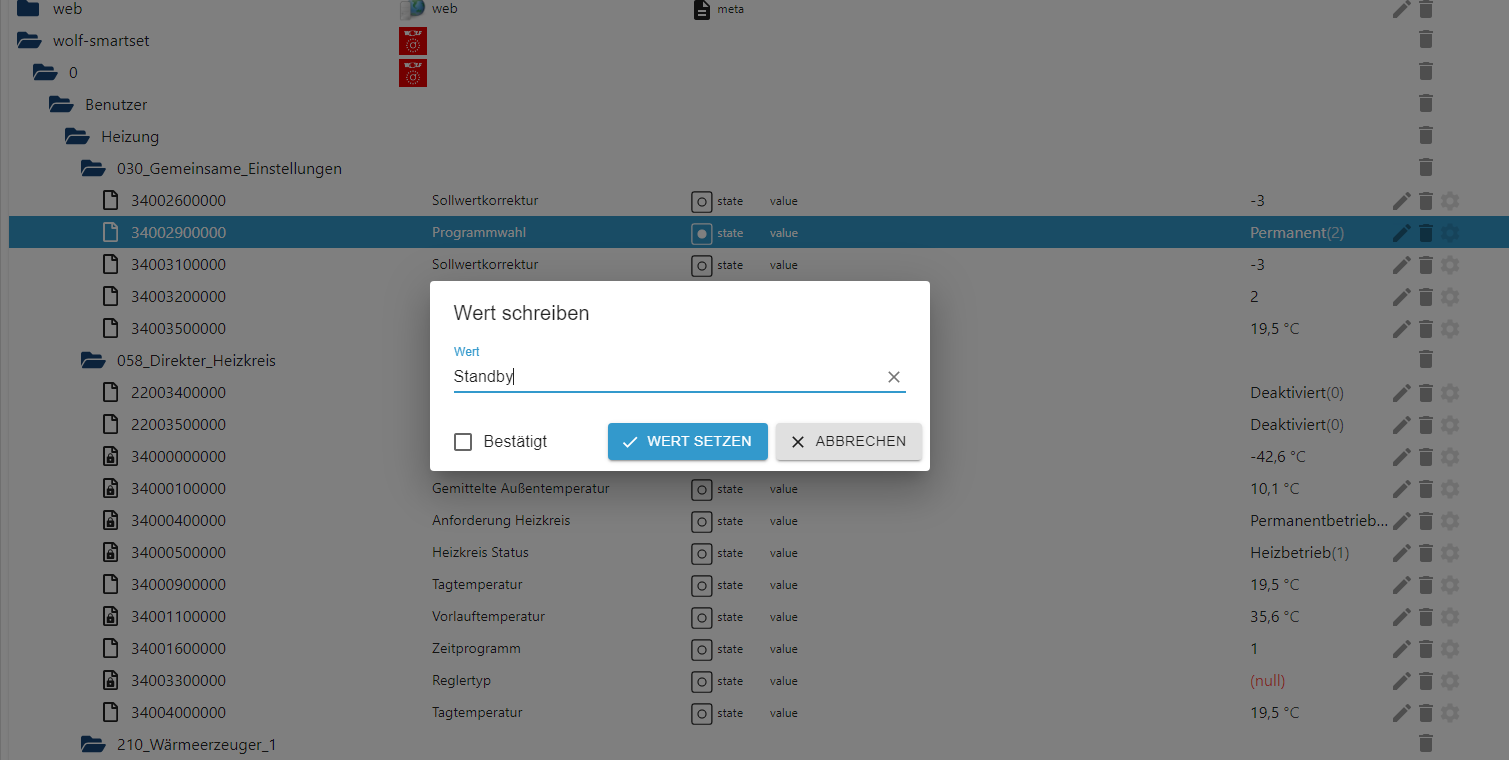 Ich habe folgende Ausgangs Situation:Eine Wolftherme die mit IO Broker Adapter erreichbar ist.