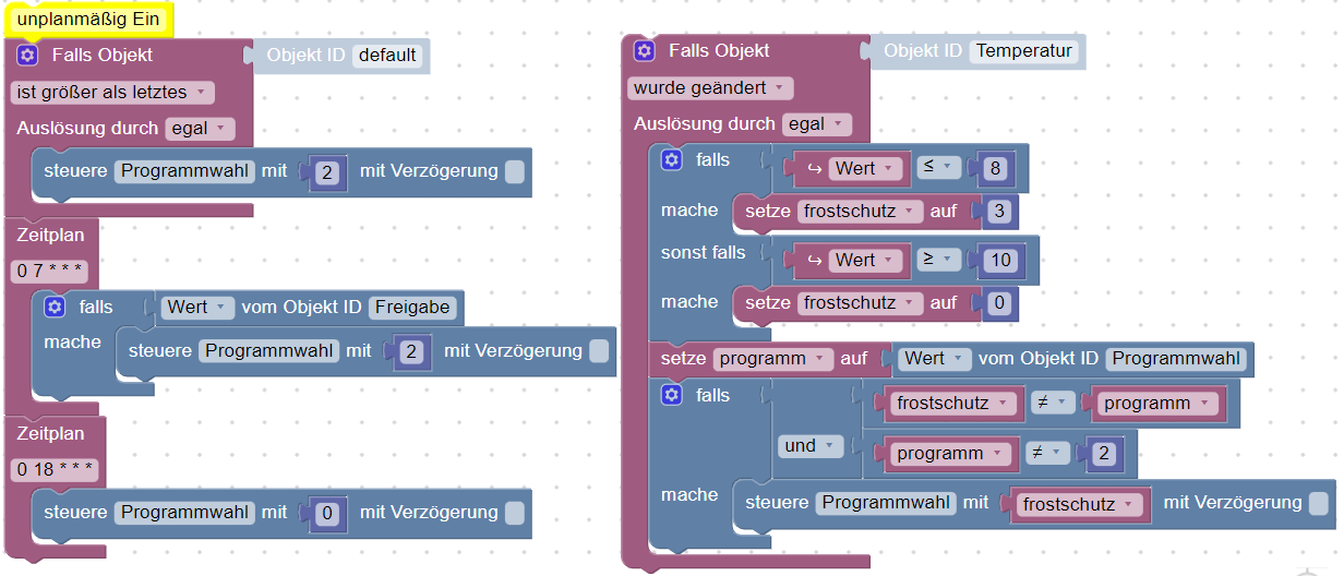 Richtig schön währe hier aber eine Eingriffsmöglichkeit über nen button( Datenpunkt ) von VIS falls ich weis das ich morgen nicht komme das ich entsprechend das übermitteln kann um nicht unnötig zu heitzen.Genauso bräuchte es einen button im vis um die Heizung unplanmäßig einzuschalten.