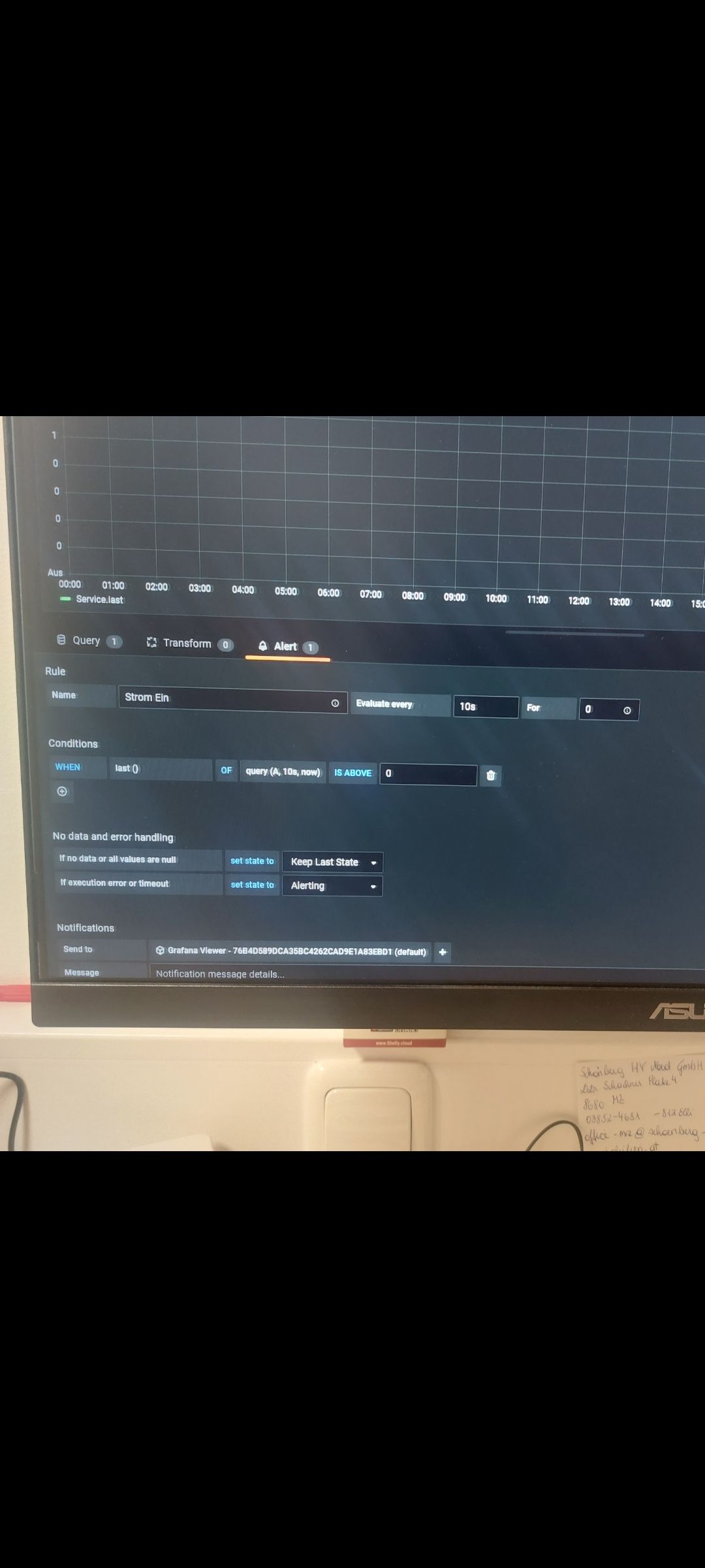Aber nach dem er den schalt Zustand ändert bekomme ich eine Fehlermeldung:Execution Error: tsdb.HandleRequest() error Post "http://localhost:8086/query?db=shelly&epoch=s": dial tcp [::1]:8086: connect: connection refused