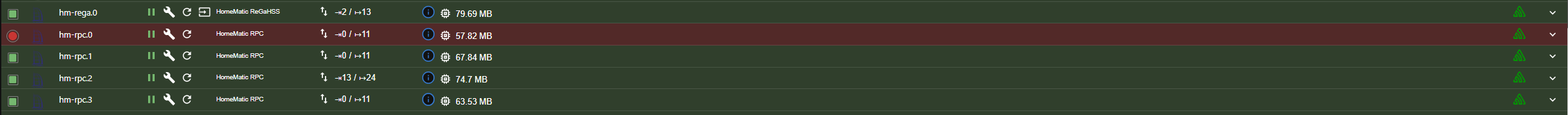 Auf RPC0 soll laufen CuX - tut es aber nicht, RPC1 = Homematic "classic" - läuft, RPC2 = HomematicIP - läuft, RPC3 = virtuell - läuft.