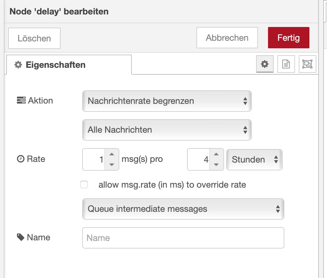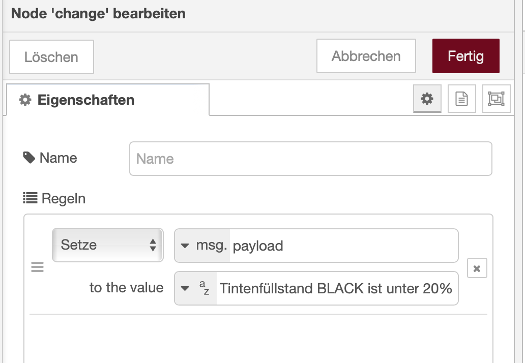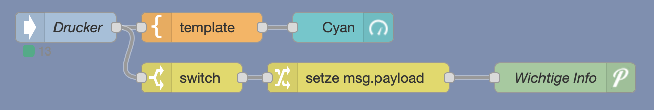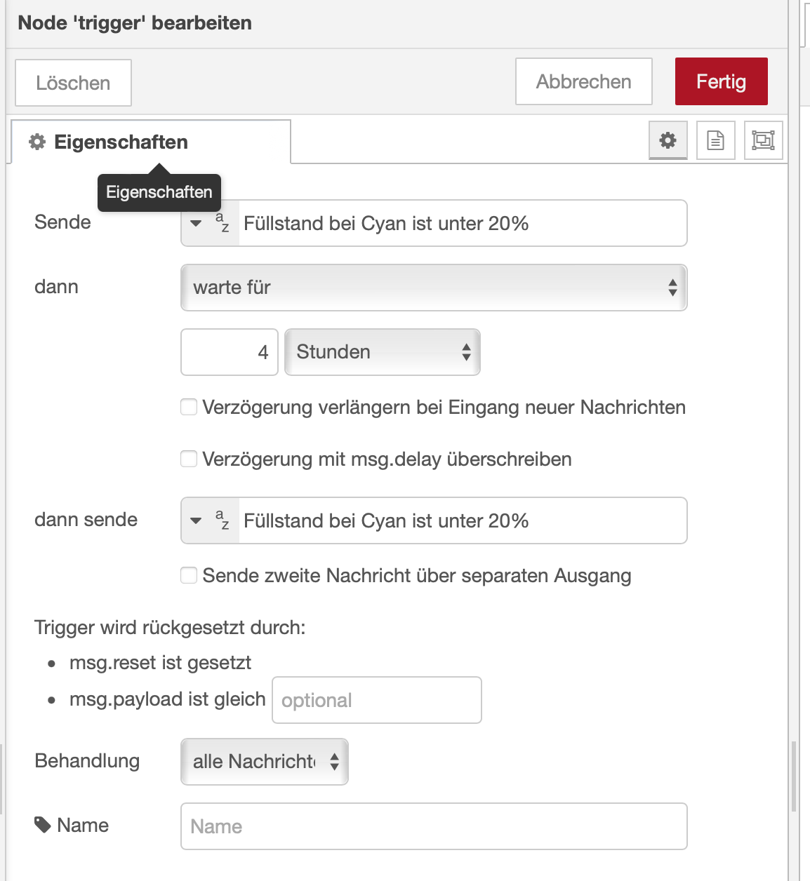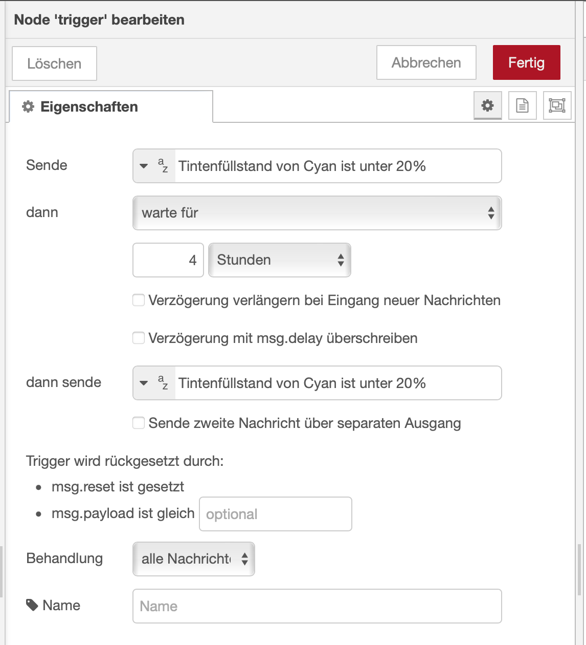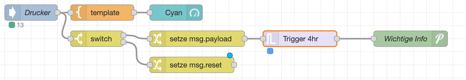 Habe die Pushover Nodes jetzt mal kurzfristig abgehängt@damrak2022 Das blaue Quadrat zeigt an, dass die trigger node aktiv ist. Mach halt debug nodes dran und prüfe . Wenn von Deinem Drucker immer neue Nachrichten kommen, dann mach doch eine Delay Node mit den Einstellungen dran, lass aber die msg.reset Node ebenfalls dran und verkabel die mit der Delay Node - so dass diese wenn der Tintenstand wieder >20% ist sofort zurückgesetzt wird.