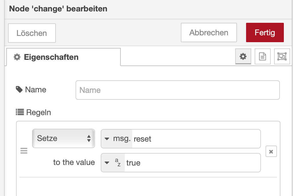 @damrak2022 Na ja - was soll ein msg.reset Node - die nicht mit der Trigger Node verkabelt ist. - Ausserdem KEIN String true - sondern ein Boolean - Datentyp!!!!