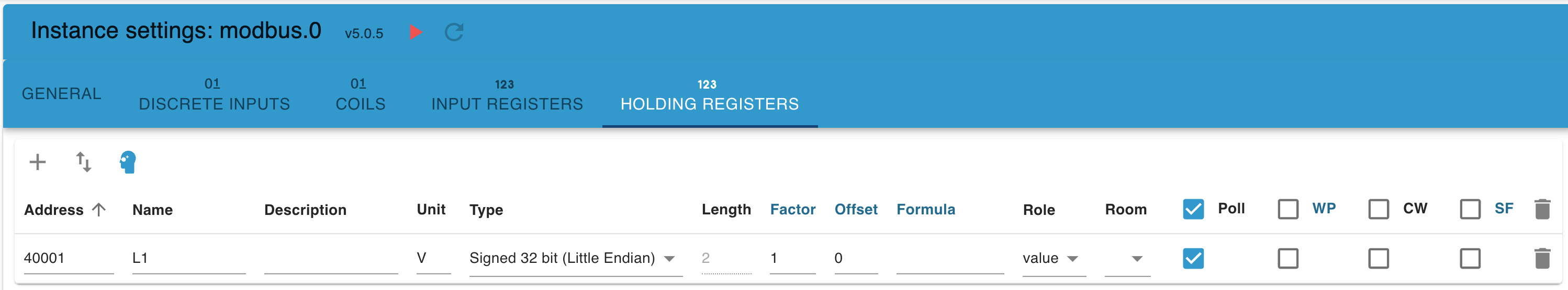 modbus.0 2022-11-17 17:09:56.195 debug Add holdingRegisters.40001_L1: {"_id":"holdingRegisters.40001_L1","type":"state","common":{"name":"","role":"value","type":"number","read":true,"write":true,"def":0,"unit":"V"},"native":{"regType":"holdingRegs","address":0,"deviceId":1,"type":"int32le","len":2,"offset":0,"factor":1,"poll":true}}