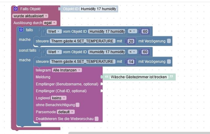 Wenn die Feuchtigkeit über 60 % geht soll das Heizungstermostat auf 20 Grad gehen und wenn die Wäsche unter 60 % ist, soll das Termostat auf 14 Grad gehen und mirt eine Nachricht über Telegram schicken das die Wäsche trocken ist.