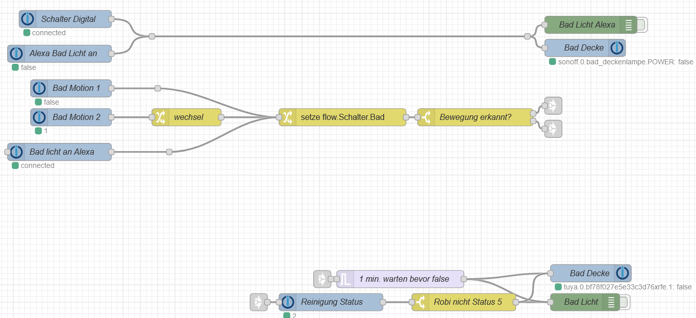 Du fragst ob die Nachrichteneigenschaft payload auf einen String "Schalter.Bad" ab, der wird von den Bewegungsmeldern SICHER nicht geliefert. In diesem Fall blockiert die switch Node ALLE Nachrichten.